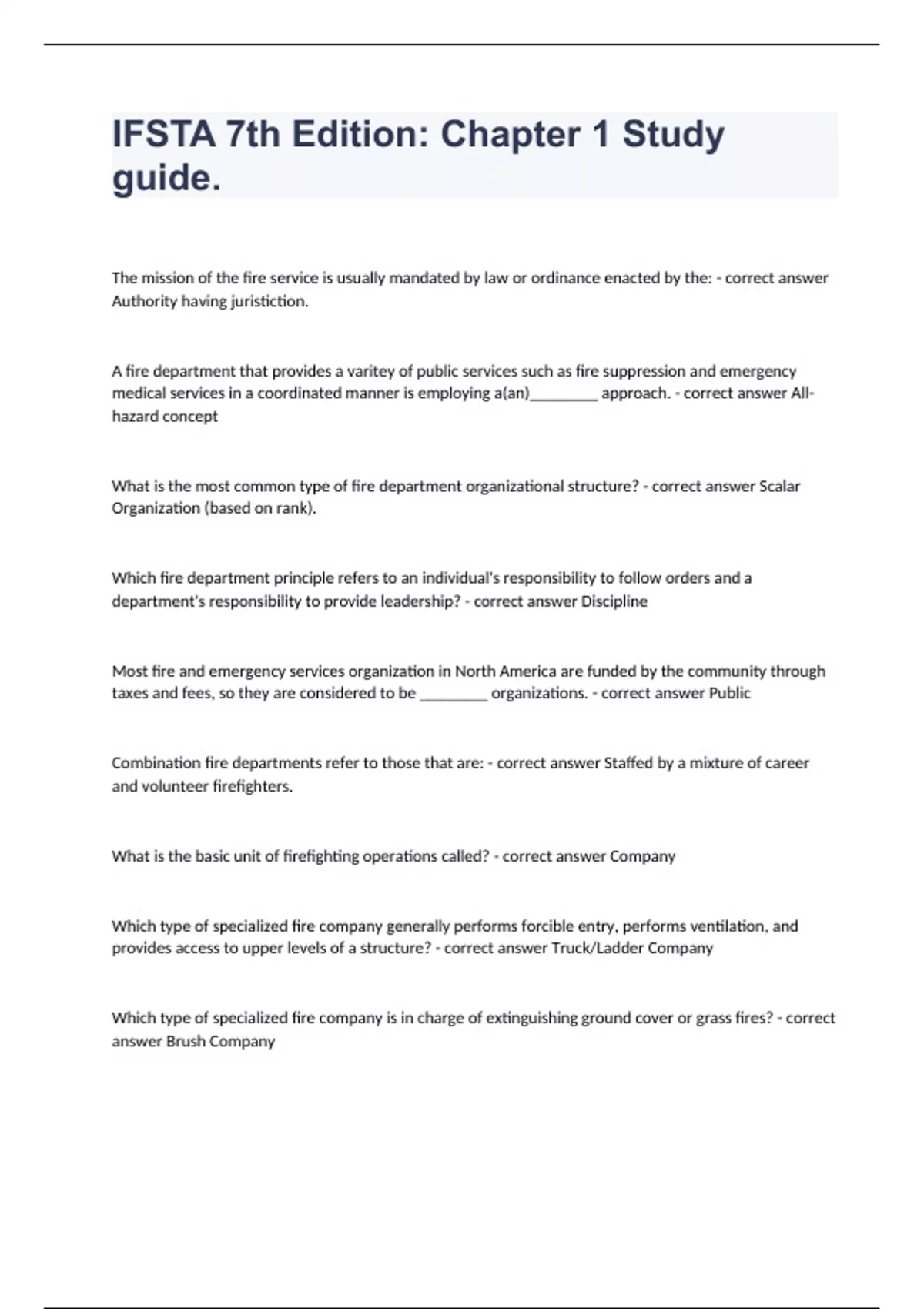 IFSTA 7th Edition: Chapter 1 Study guideThe mission of the fire service is usually mandated by law or ordinance enacted by the: - correct answer Authority having juristiction. A fire department that provides a varitey of public services such as fire suppression and emergency medical services in a coordinated manner is employing a(an)________ approach. - correct answer All-hazard concept What is the most common type of fire department organizational structure? - correct answer Scalar Organization (based on rank). Which fire department principle refers to an individual's responsibility to follow orders and a department's responsibility to provide leadership? - correct answer Discipline Most fire and emergency services organization in North America are funded by the community through taxes and fees, so they are considered to be ________ organizations. - correct answer Public Combination fire departments refer to those that are: - correct answer Staffed by a mixture of career and volunteer firefighters. What is the basic unit of firefighting operations called? - correct answer Company Which type of specialized fire company generally performs forcible entry, performs ventilation, and provides access to upper levels of a structure? - correct answer Truck/Ladder Company Which type of specialized fire company is in charge of extinguishing ground cover or grass fires? - correct answer Brush Company Firefighters who work a required scheduled and receive pay and benefits for their work are referred to as: - correct answer Career firefighters The basic criteria for Fire fighter I competency and professionalism is established in: - correct answer NFPA 1001 Which individual or entity is in charge of setting, the age and educational requirements for employment at a fire department? - correct answer National Fire Protection Association (NFPA). Which statement accurately describes a difference in level of responsibilities and duties of a Fire Fighter I and Fire Fighter II? - correct answer Firefighter II may assume command within the Incident Command System, but a Firefighter I may not. Which type of fire service specialization includes personnel who are specifically certified to mitigate chemical, biological, radiological, nuclear, or explosive emergencies? - correct answer Hazardous materials technician Which type of fire officer is generally tasked with managing the fire prevention, plans review, and investigation division of a fire department? - correct answer Fire Marshal Which type of fire officer directly supervises a group of fire companies? - correct answer Battalion/District chief Which duty is the responsibility of the fire prevention division of a fire department? - correct answer Code enforcement and community risk reduction. Which individual oversees all training activities and supervises training division personnel? - correct answer Training officer What kind of regulation is a guide to decision-making within an organization and addresses issues such as working hours or emergency response guidelines? - correct answer Policy