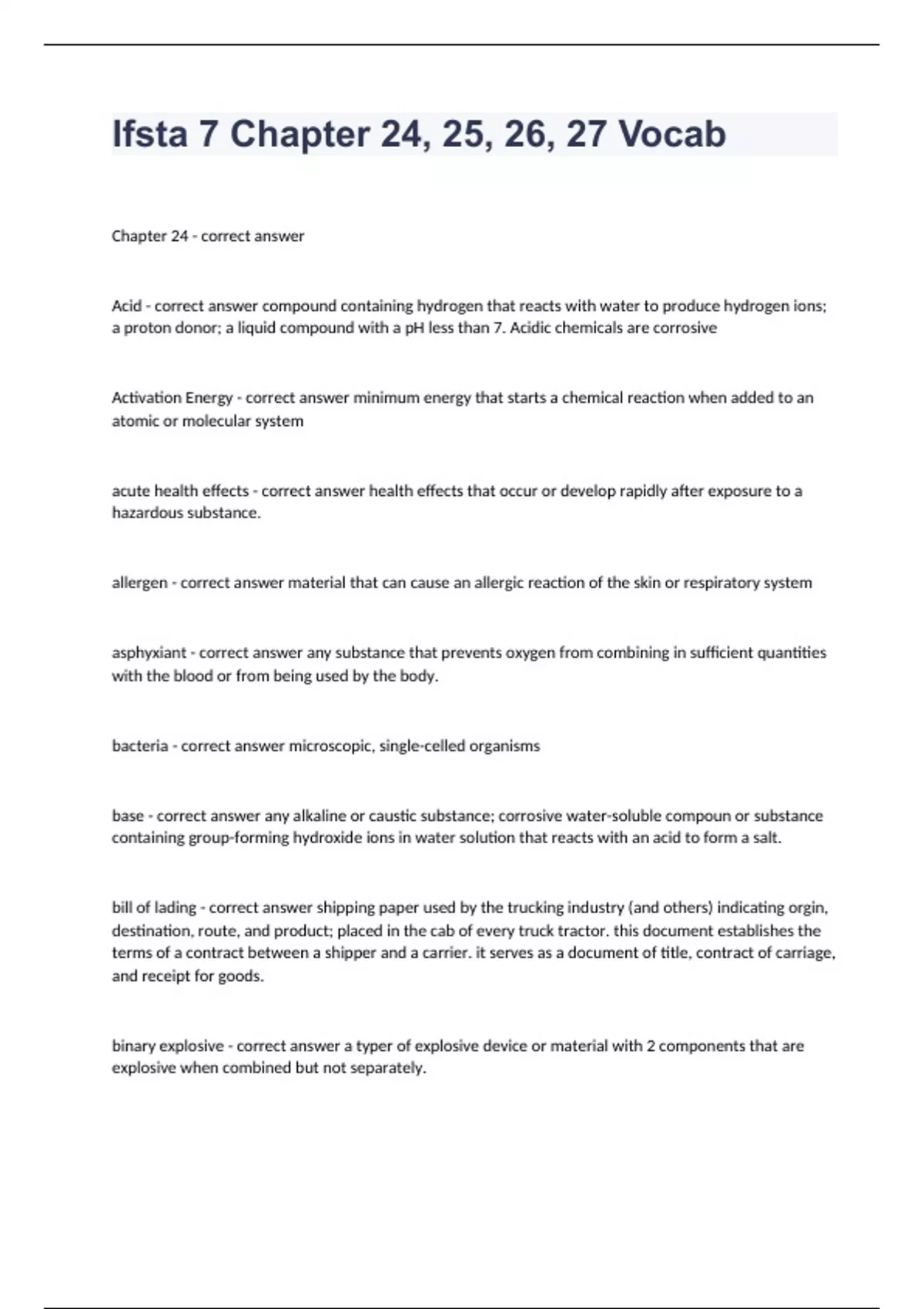 Ifsta 7 Chapter 24, 25, 26, 27 VocabChapter 24 - correct answer Acid - correct answer compound containing hydrogen that reacts with water to produce hydrogen ions; a proton donor; a liquid compound with a pH less than 7. Acidic chemicals are corrosive Activation Energy - correct answer minimum energy that starts a chemical reaction when added to an atomic or molecular system acute health effects - correct answer health effects that occur or develop rapidly after exposure to a hazardous substance. allergen - correct answer material that can cause an allergic reaction of the skin or respiratory system asphyxiant - correct answer any substance that prevents oxygen from combining in sufficient quantities with the blood or from being used by the body. bacteria - correct answer microscopic, single-celled organisms base - correct answer any alkaline or caustic substance; corrosive water-soluble compoun or substance containing group-forming hydroxide ions in water solution that reacts with an acid to form a salt. bill of lading - correct answer shipping paper used by the trucking industry (and others) indicating orgin, destination, route, and product; placed in the cab of every truck tractor. this document establishes the terms of a contract between a shipper and a carrier. it serves as a document of title, contract of carriage, and receipt for goods. binary explosive - correct answer a typer of explosive device or material with 2 components that are explosive when combined but not separately.