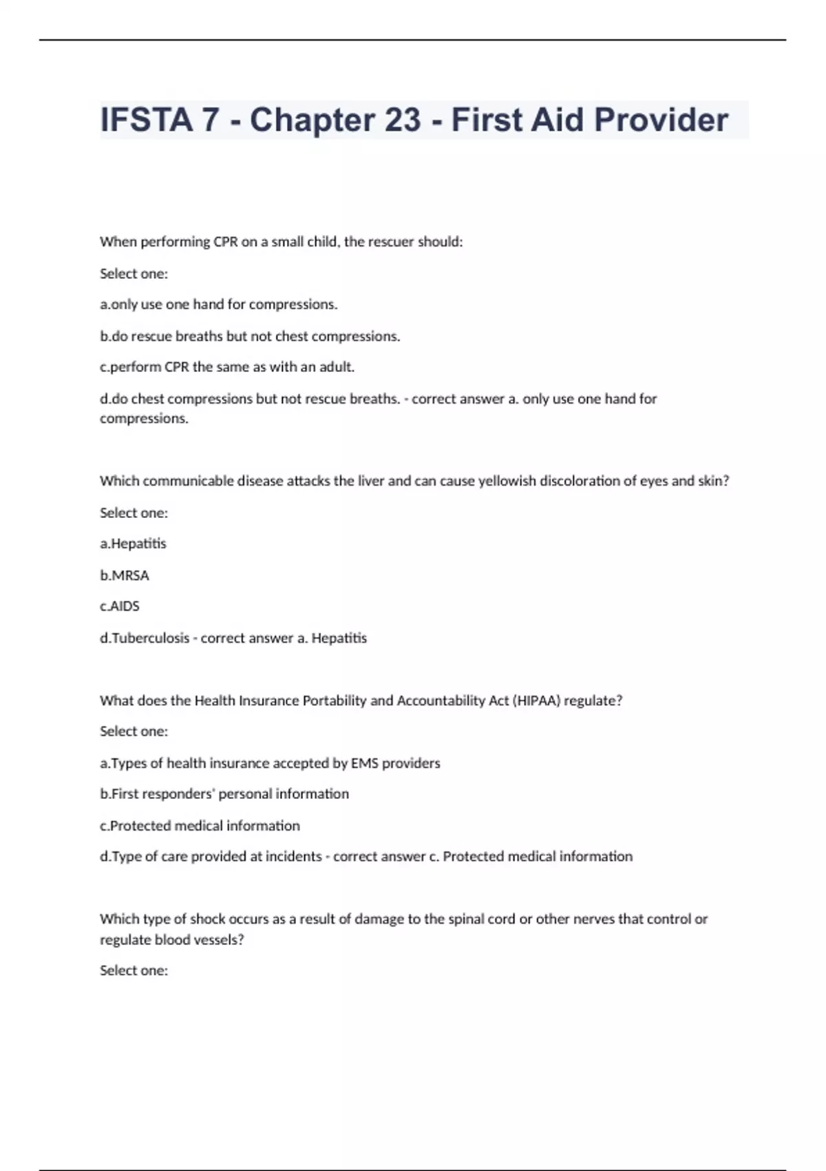 IFSTA 7 - Chapter 23 - First Aid ProviderWhen performing CPR on a small child, the rescuer should: Select one: use one hand for compressions. rescue breaths but not chest compressions. rm CPR the same as with an adult. chest compressions but not rescue breaths. - correct answer a. only use one hand for compressions. Which communicable disease attacks the liver and can cause yellowish discoloration of eyes and skin? Select one: a.Hepatitis b.MRSA c.AIDS d.Tuberculosis - correct answer a. Hepatitis What does the Health Insurance Portability and Accountability Act (HIPAA) regulate? Select one: a.Types of health insurance accepted by EMS providers b.First responders' personal information c.Protected medical information d.Type of care provided at incidents - correct answer c. Protected medical information Which type of shock occurs as a result of damage to the spinal cord or other nerves that control or regulate blood vessels? Select one: a.Neurogenic b.Hypovolemic c.Hypervolemic d.Cardiogenic - correct answer a. Neurogenic No matter what kind of ambulance service is provided in a jurisdiction, it is important that firefighters: Select one: regularly with EMS personnel. nd to every medical call. the same level of medical training as EMS personnel. how to drive the ambulance if it becomes necessary. - correct answer a. train regularly with EMS personnel. What is the first step when performing CPR on an adult? Select one: a.Press down on the victim's chest b.Place hands on center of victim's chest c.Tilt the victim's head back to open his or her airway d.Breathe twice into the victim's mouth - correct answer c. Tilt the victim's head back to open his or her airway Patients with _____ bleeding may lose a great deal of blood in a short time, and should be quickly transported to the hospital. Select one: s lary ral ial - correct answer d. arterial When is a patient considered clinically dead? Select one: