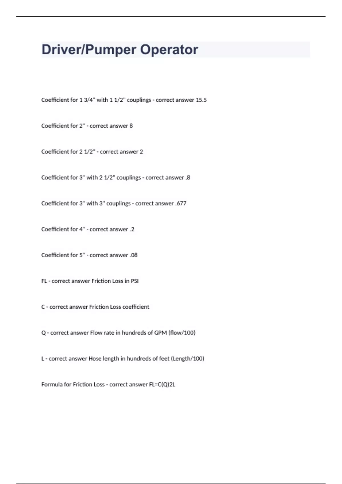 Driver/Pumper OperatorCoefficient for 1 3/4" with 1 1/2" couplings - correct answer 15.5 Coefficient for 2" - correct answer 8 Coefficient for 2 1/2" - correct answer 2 Coefficient for 3" with 2 1/2" couplings - correct answer .8 Coefficient for 3" with 3" couplings - correct answer .677 Coefficient for 4" - correct answer .2 Coefficient for 5" - correct answer .08 FL - correct answer Friction Loss in PSI C - correct answer Friction Loss coefficient Q - correct answer Flow rate in hundreds of GPM (flow/100) L - correct answer Hose length in hundreds of feet (Length/100) Formula for Friction Loss - correct answer FL=C(Q)2L Volume = Q=GPM's What is the equation? - correct answer Q= 29.7 x (D)2 x √NP Nozzle reaction for a smooth bore - correct answer NR= 1.57 x (D)2 x √NP Nozzle Reaction for a Fog - correct answer NR= .0505 x Q x √NP Handline Tip 3/4 flows how many gpm's - correct answer 100 gpm's flows through what size handline tip Handline tip 7/8 flow how many gpm's - correct answer 150 gpm's flows through what size handline tip Handline tip 1" flows how many gpm's - correct answer 200 gpm's flows through what size handline tip Handline tip 1 1/8" flows how many gpm's - correct answer 250 gpm's flows through what size handline tip Handline tip 1 1/4" flow how many gpm's - correct answer 300 gpm's flows through what size handline tip Master Stream tip 1 1/4" flow's how many gpm's - correct answer 400 gpm's flows through what size master stream tip Master Stream tip 1 3/8" flows how many gpm's - correct answer 500 gpm's flows through what size master stream tip Master Stream tip 1 1/2" flows how many gpm's - correct answer 600 gpm's flows through what size master stream tip Master Stream tip 1 5/8" flows how many gpm's - correct answer 700 gpm's flows through what size master stream tip