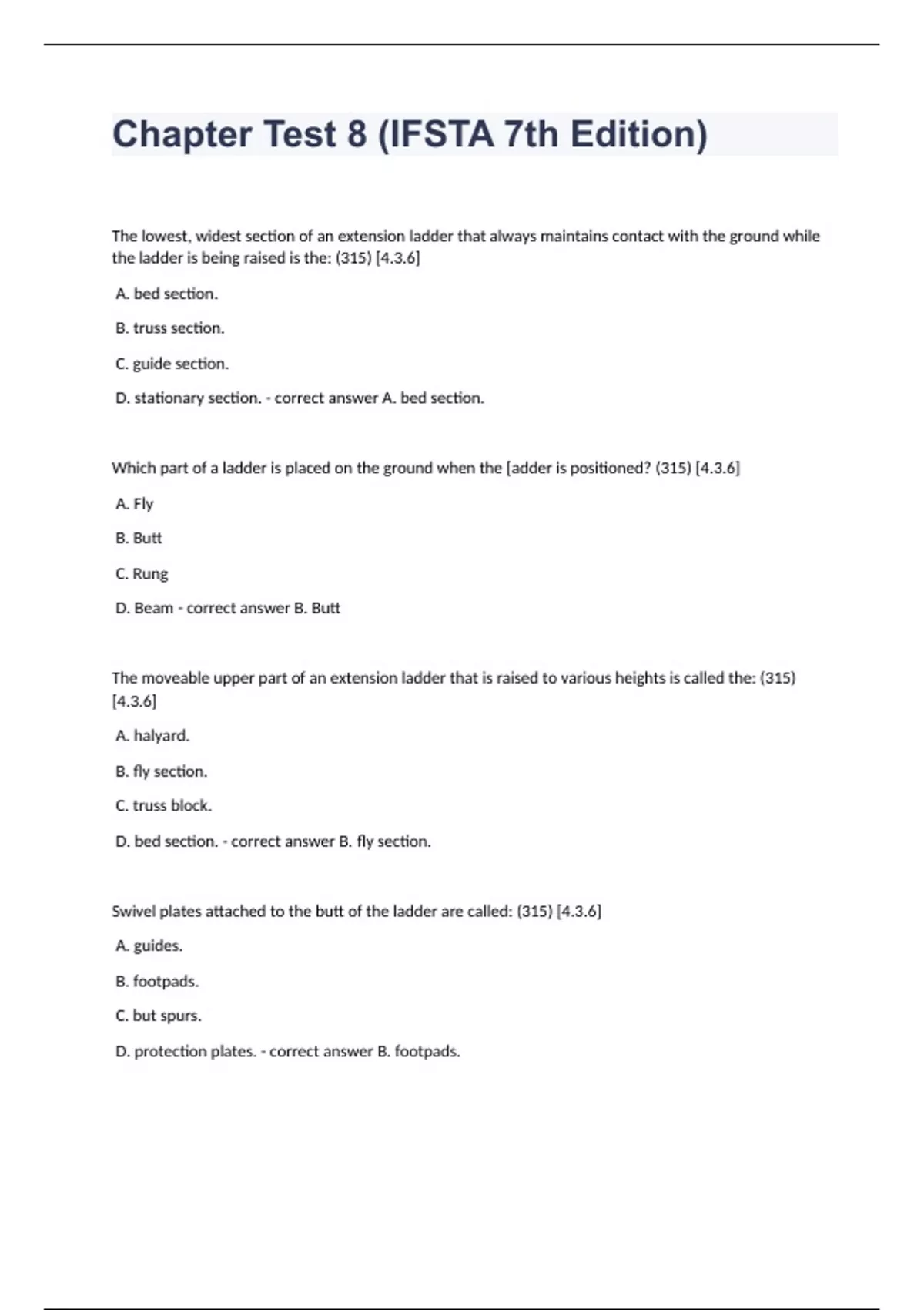 Chapter Test 8 (IFSTA 7th Edition)The lowest, widest section of an extension ladder that always maintains contact with the ground while the ladder is being raised is the: (315) [4.3.6] A. bed section. B. truss section. C. guide section. D. stationary section. - correct answer A. bed section. Which part of a ladder is placed on the ground when the [adder is positioned? (315) [4.3.6] A. Fly B. Butt C. Rung D. Beam - correct answer B. Butt The moveable upper part of an extension ladder that is raised to various heights is called the: (315) [4.3.6] A. halyard. B. fly section. C. truss block. D. bed section. - correct answer B. fly section. Swivel plates attached to the butt of the ladder are called: (315) [4.3.6] A. guides. B. footpads. C. but spurs. D. protection plates. - correct answer B. footpads.