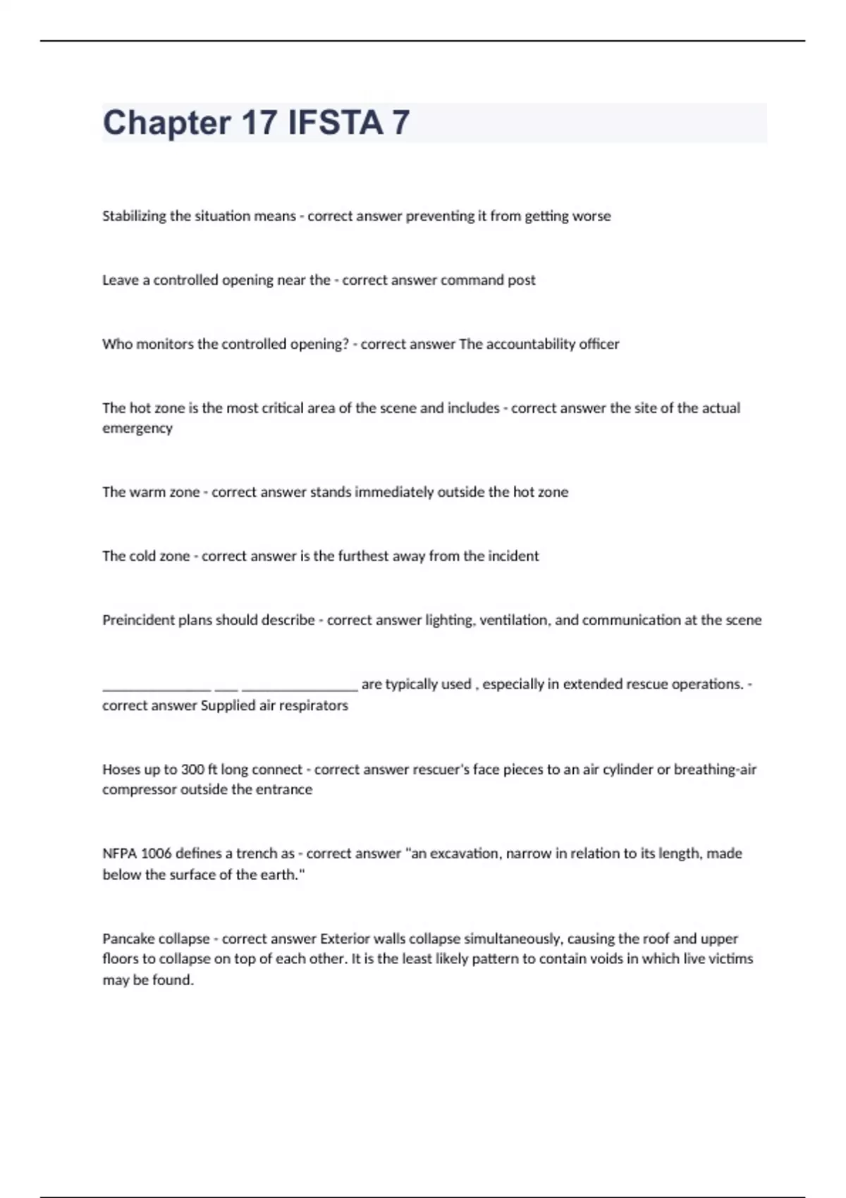Chapter 17 IFSTA 7Stabilizing the situation means - correct answer preventing it from getting worse Leave a controlled opening near the - correct answer command post Who monitors the controlled opening? - correct answer The accountability officer The hot zone is the most critical area of the scene and includes - correct answer the site of the actual emergency The warm zone - correct answer stands immediately outside the hot zone The cold zone - correct answer is the furthest away from the incident Preincident plans should describe - correct answer lighting, ventilation, and communication at the scene ______________ ___ _______________ are typically used , especially in extended rescue operations. - correct answer Supplied air respirators Hoses up to 300 ft long connect - correct answer rescuer's face pieces to an air cylinder or breathing-air compressor outside the entrance NFPA 1006 defines a trench as - correct answer "an excavation, narrow in relation to its length, made below the surface of the earth." Pancake collapse - correct answer Exterior walls collapse simultaneously, causing the roof and upper floors to collapse on top of each other. It is the least likely pattern to contain voids in which live victims may be found.