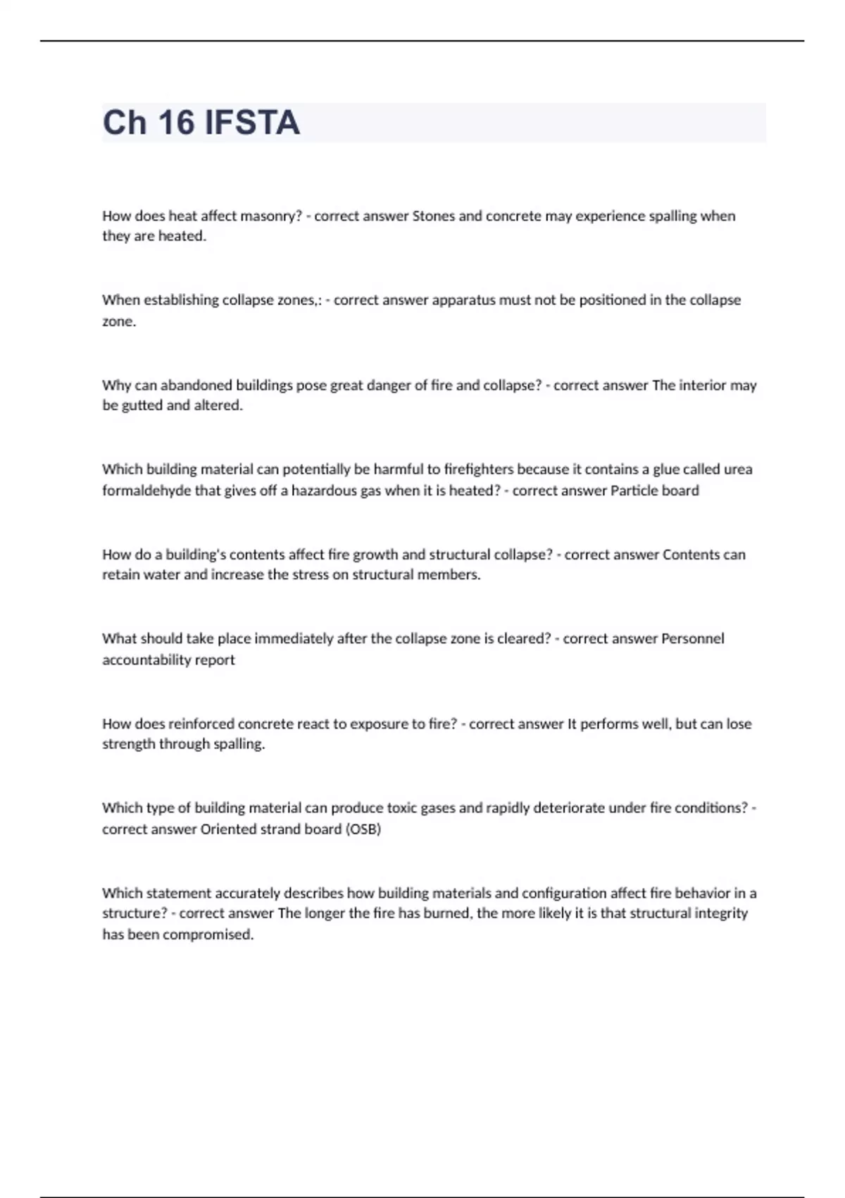 Ch 16 IFSTAHow does heat affect masonry? - correct answer Stones and concrete may experience spalling when they are heated. When establishing collapse zones,: - correct answer apparatus must not be positioned in the collapse zone. Why can abandoned buildings pose great danger of fire and collapse? - correct answer The interior may be gutted and altered. Which building material can potentially be harmful to firefighters because it contains a glue called urea formaldehyde that gives off a hazardous gas when it is heated? - correct answer Particle board How do a building's contents affect fire growth and structural collapse? - correct answer Contents can retain water and increase the stress on structural members. What should take place immediately after the collapse zone is cleared? - correct answer Personnel accountability report How does reinforced concrete react to exposure to fire? - correct answer It performs well, but can lose strength through spalling. Which type of building material can produce toxic gases and rapidly deteriorate under fire conditions? - correct answer Oriented strand board (OSB) Which statement accurately describes how building materials and configuration affect fire behavior in a structure? - correct answer The longer the fire has burned, the more likely it is that structural integrity has been compromised.