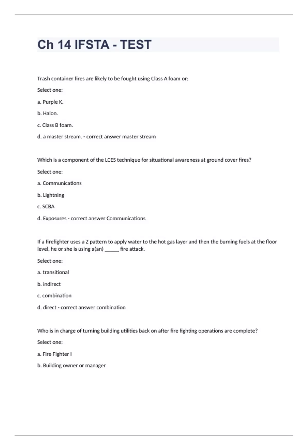 Ch 14 IFSTA - TESTTrash container fires are likely to be fought using Class A foam or: Select one: a. Purple K. b. Halon. c. Class B foam. d. a master stream. - correct answer master stream Which is a component of the LCES technique for situational awareness at ground cover fires? Select one: a. Communications b. Lightning c. SCBA d. Exposures - correct answer Communications If a firefighter uses a Z pattern to apply water to the hot gas layer and then the burning fuels at the floor level, he or she is using a(an) _____ fire attack. Select one: a. transitional b. indirect c. combination d. direct - correct answer combination Who is in charge of turning building utilities back on after fire fighting operations are complete? Select one: a. Fire Fighter I b. Building owner or manager