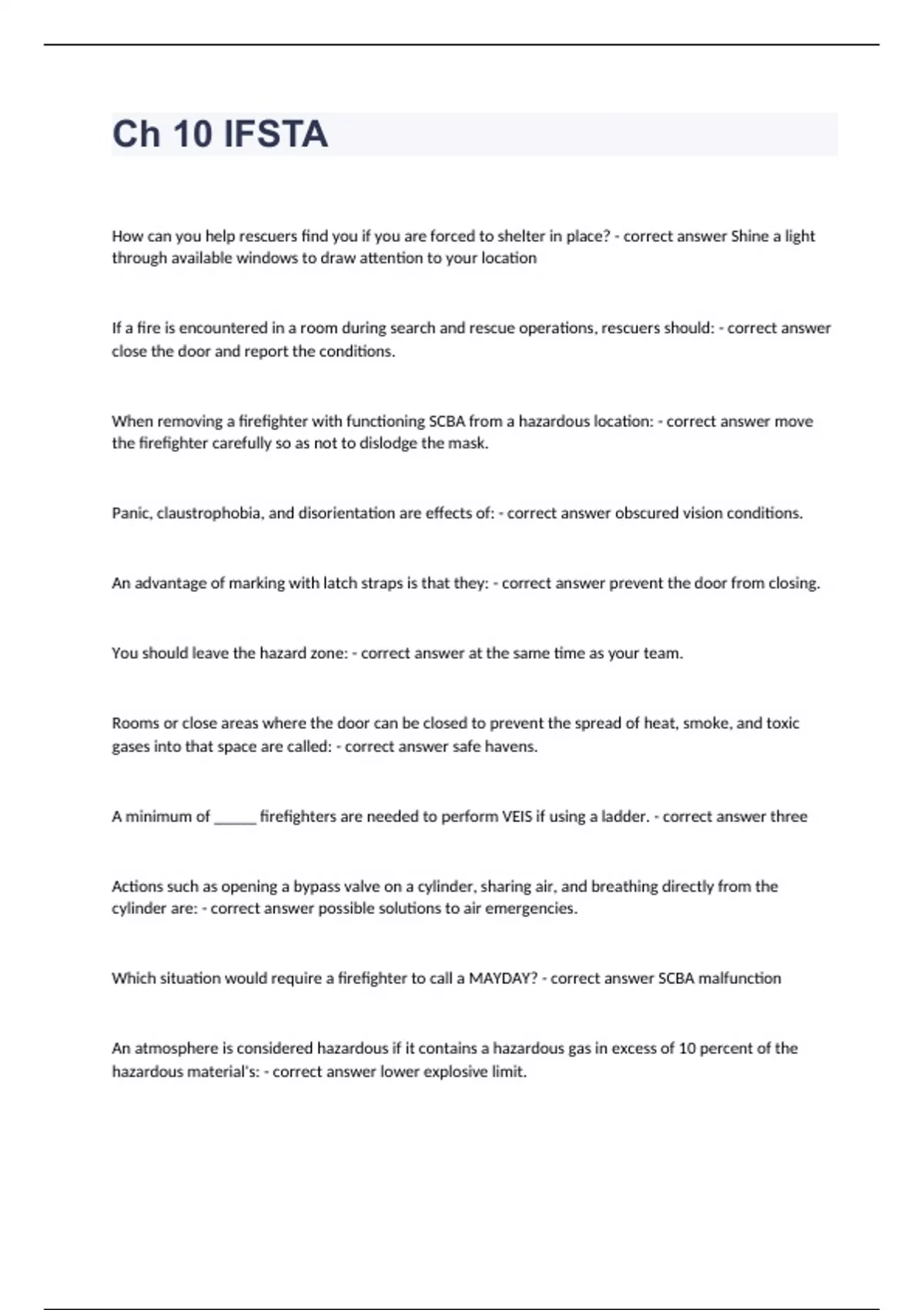 Ch 10 IFSTAHow can you help rescuers find you if you are forced to shelter in place? - correct answer Shine a light through available windows to draw attention to your location If a fire is encountered in a room during search and rescue operations, rescuers should: - correct answer close the door and report the conditions. When removing a firefighter with functioning SCBA from a hazardous location: - correct answer move the firefighter carefully so as not to dislodge the mask. Panic, claustrophobia, and disorientation are effects of: - correct answer obscured vision conditions. An advantage of marking with latch straps is that they: - correct answer prevent the door from closing. You should leave the hazard zone: - correct answer at the same time as your team. Rooms or close areas where the door can be closed to prevent the spread of heat, smoke, and toxic gases into that space are called: - correct answer safe havens. A minimum of _____ firefighters are needed to perform VEIS if using a ladder. - correct answer three Actions such as opening a bypass valve on a cylinder, sharing air, and breathing directly from the cylinder are: - correct answer possible solutions to air emergencies.
