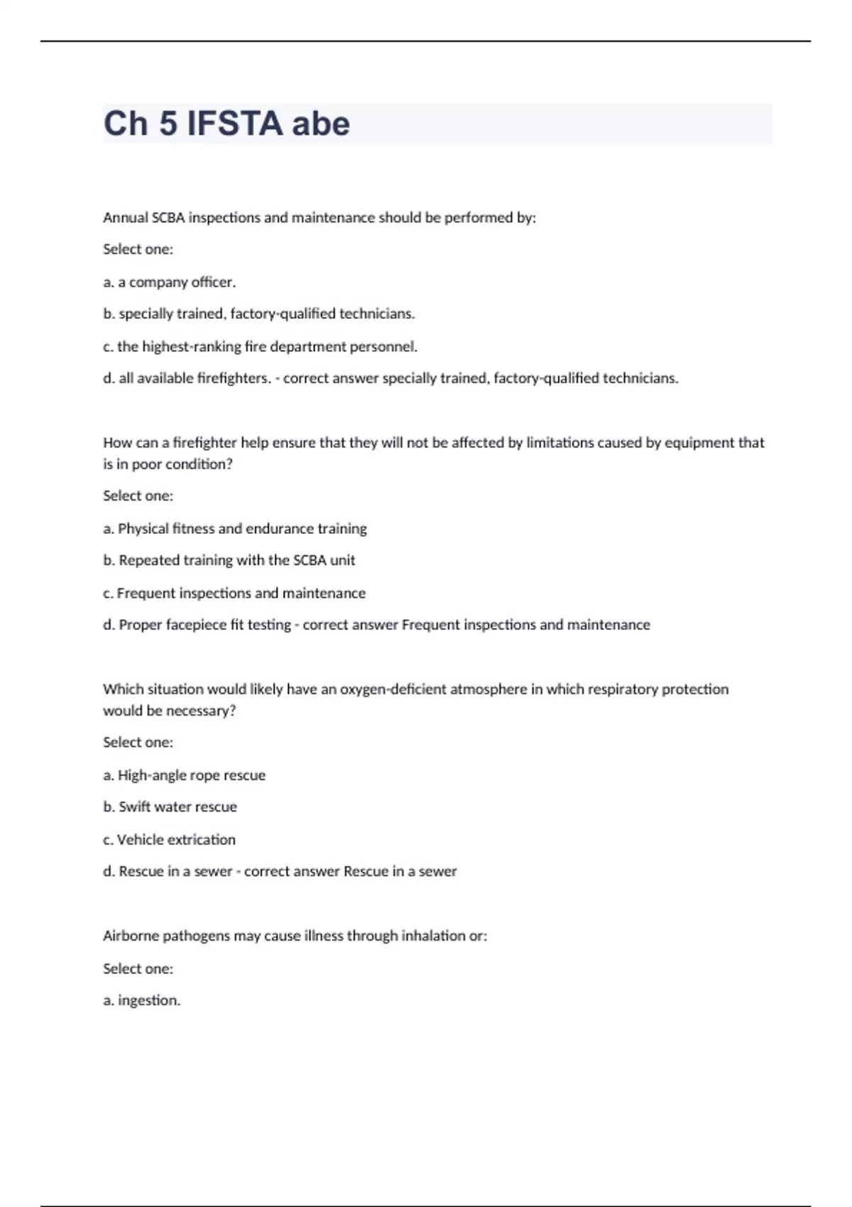Ch 5 IFSTA Annual SCBA inspections and maintenance should be performed by: Select one: a. a company officer. b. specially trained, factory-qualified technicians. c. the highest-ranking fire department personnel. d. all available firefighters. - correct answer specially trained, factory-qualified technicians. How can a firefighter help ensure that they will not be affected by limitations caused by equipment that is in poor condition? Select one: a. Physical fitness and endurance training b. Repeated training with the SCBA unit c. Frequent inspections and maintenance d. Proper facepiece fit testing - correct answer Frequent inspections and maintenance Which situation would likely have an oxygen-deficient atmosphere in which respiratory protection would be necessary? Select one: a. High-angle rope rescue b. Swift water rescue c. Vehicle extrication d. Rescue in a sewer - correct answer Rescue in a sewer Airborne pathogens may cause illness through inhalation or: Select one: a. ingestion.