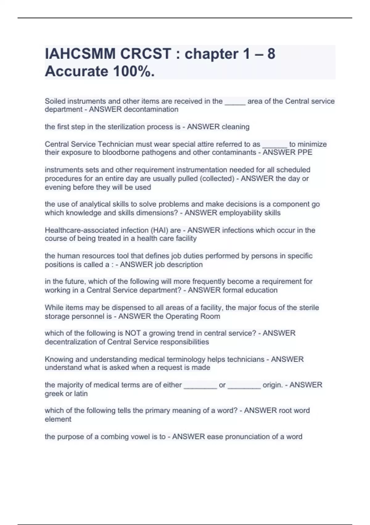 Soiled instruments and other items are received in the _____ area of the Central service department - ANSWER decontamination the first step in the sterilization process is - ANSWER cleaning Central Service Technician must wear special attire referred to as ______ to minimize their exposure to bloodborne pathogens and other contaminants - ANSWER PPE instruments sets and other requirement instrumentation needed for all scheduled procedures for an entire day are usually pulled (collected) - ANSWER the day or evening before they will be used the use of analytical skills to solve problems and make decisions is a component go which knowledge and skills dimensions? - ANSWER employability skills Healthcare-associated infection (HAI) are - ANSWER infections which occur in the course of being treated in a health care facility the human resources tool that defines job duties performed by persons in specific positions is called a : - ANSWER job description in the future, which of the following will more frequently become a requirement for working in a Central Service department? - ANSWER formal education While items may be dispensed to all areas of a facility, the major focus of the sterile storage personnel is - ANSWER the Operating Room which of the following is NOT a growing trend in central service? - ANSWER decentralization of Central Service responsibilities Knowing and understanding medical terminology helps technicians - ANSWER understand what is asked when a request is made the majority of medical terms are of either ________ or ________ origin. - ANSWER greek or latin which of the following tells the primary meaning of a word? - ANSWER root word element the purpose of a combing vowel is to - ANSWER ease pronunciation of a word the last word element in a medical terms is the - ANSWER suffix the term ITIS mean - ANSWER inflammation the term ectomy mean - ANSWER surgical removal the term oscopy mean - ANSWER visual examination arthroscopy means - ANSWER visual exam of a joint the term ostomy - ANSWER is a suffix the suffix -tome means a - ANSWER cutting instrument pasty is a - ANSWER suffix meaning surgical restoration the word laminectomy mean - ANSWER removal of a part of a lamina which of the following means beside or near? - ANSWER para which of the following surgical abbreviations might be used to relating to a fractured bone? - ANSWER ORIF the term intercostal means - ANSWER between the ribs the term hypo means - ANSWER below the term septorhinoplasty means - ANSWER surgical repair of the nose encephalopathy is a/an - ANSWER disease of the brain lithotripsy means - ANSWER crushing of a stone this system gives the body shape and support - ANSWER skeletal system the tissue acts as a cushion between the bones to prevent them rom rubbing together - ANSWER cartilage these muscle control involuntary movement like breathing, digestion, etc. - ANSWER smooth