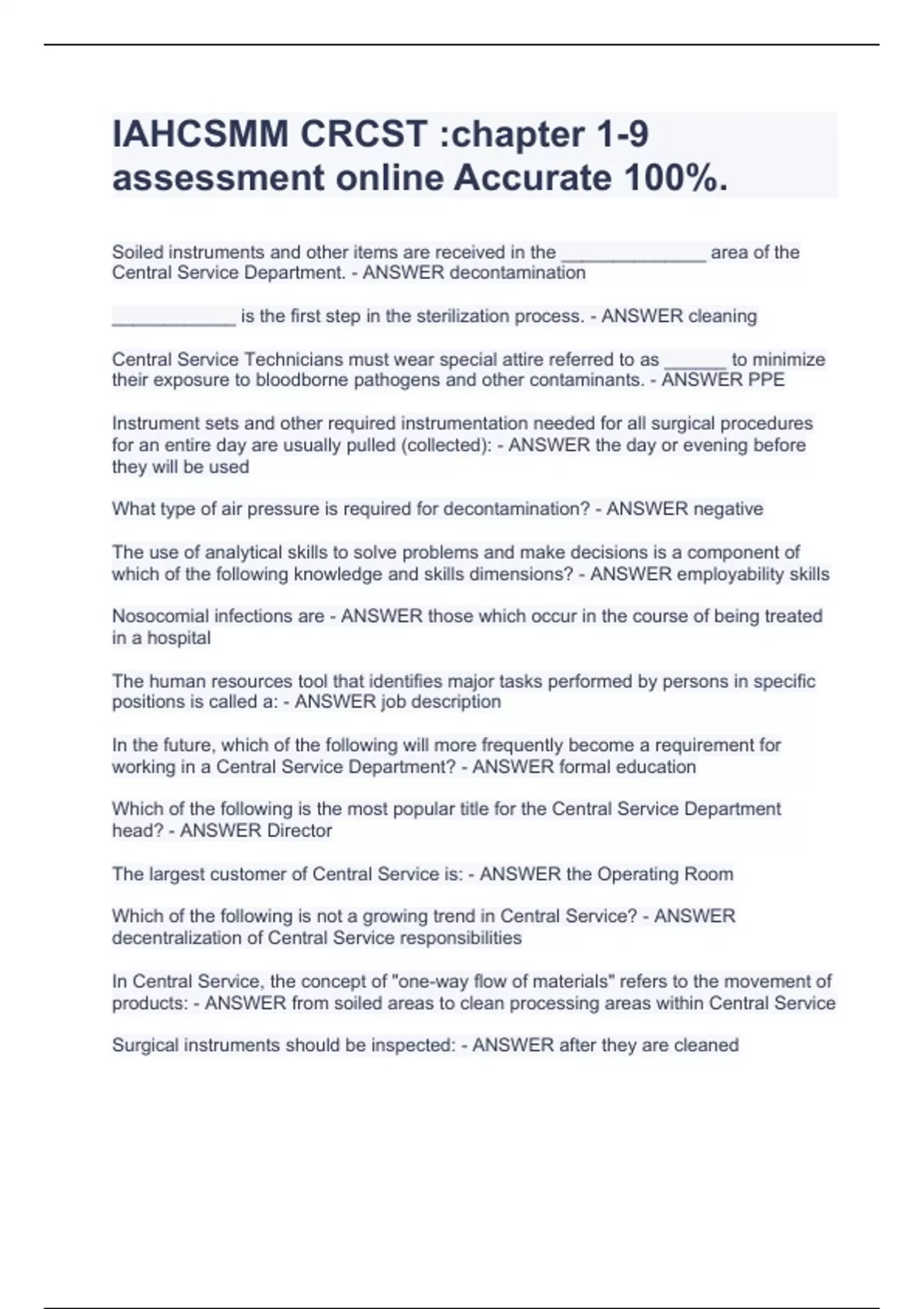 IAHCSMM CRCST :chapter 1-9 assessment online Accurate 100%.