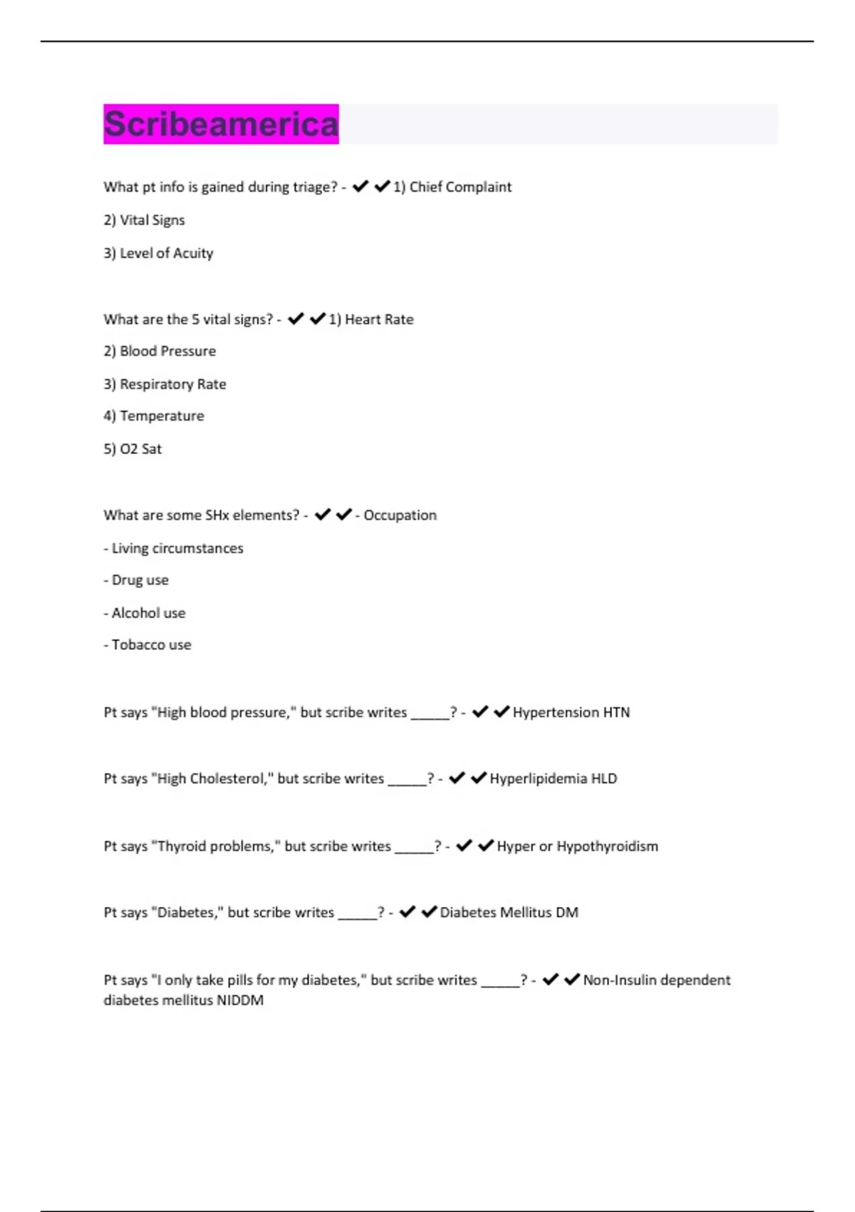 What pt info is gained during triage? - 1) Chief Complaint 2) Vital Signs 3) Level of Acuity What are the 5 vital signs? - 1) Heart Rate 2) Blood Pressure 3) Respiratory Rate 4) Temperature 5) O2 Sat What are some SHx elements? - - Occupation - Living circumstances - Drug use - Alcohol use - Tobacco use Pt says "High blood pressure," but scribe writes _____? - Hypertension HTN Pt says "High Cholesterol," but scribe writes _____? - Hyperlipidemia HLD Pt says "Thyroid problems," but scribe writes _____? - Hyper or Hypothyroidism Pt says "Diabetes," but scribe writes _____? - Diabetes Mellitus DM Pt says "I only take pills for my diabetes," but scribe writes _____? - Non-Insulin dependent diabetes mellitus NIDDMaka type 1 Pt says "I take shots for my diabetes," but scribe writes _____? - Insulin dependent diabetes mellitus IDDM Type 1 or 2 Pt says "Chronic Bronchitis," but scribe writes _____? - COPD Pt says "Blood clot in lungs," but scribe writes _____? - Pulmonary Embolism PE Pt says "Heart Disease," but scribe writes _____? - Coronary Artery Disease CAD Pt says "Heart Attack," but scribe writes _____? - Myocardial Infarction MI and CAD Pt says "Irregular Heartbeat," but scribe writes _____? - Atrial Fibrillation A-Fib Pt says "Episodes of abnormally fast heartbeat," but scribe writes _____? - Supraventricular Tachycardia SVT Pt says "Reflux," but scribe writes _____? - GERD Pt says "Bladder infection," but scribe writes _____? -UTI Pt says "Kidney Infection," but scribe writes _____? - Pyelonephritis Pt says "Kidney stones," but scribe writes _____? - renal calculi or nephrolithiasis Pt says "I'm on dialysis," but scribe writes _____? - Chronic Renal Failure CRF