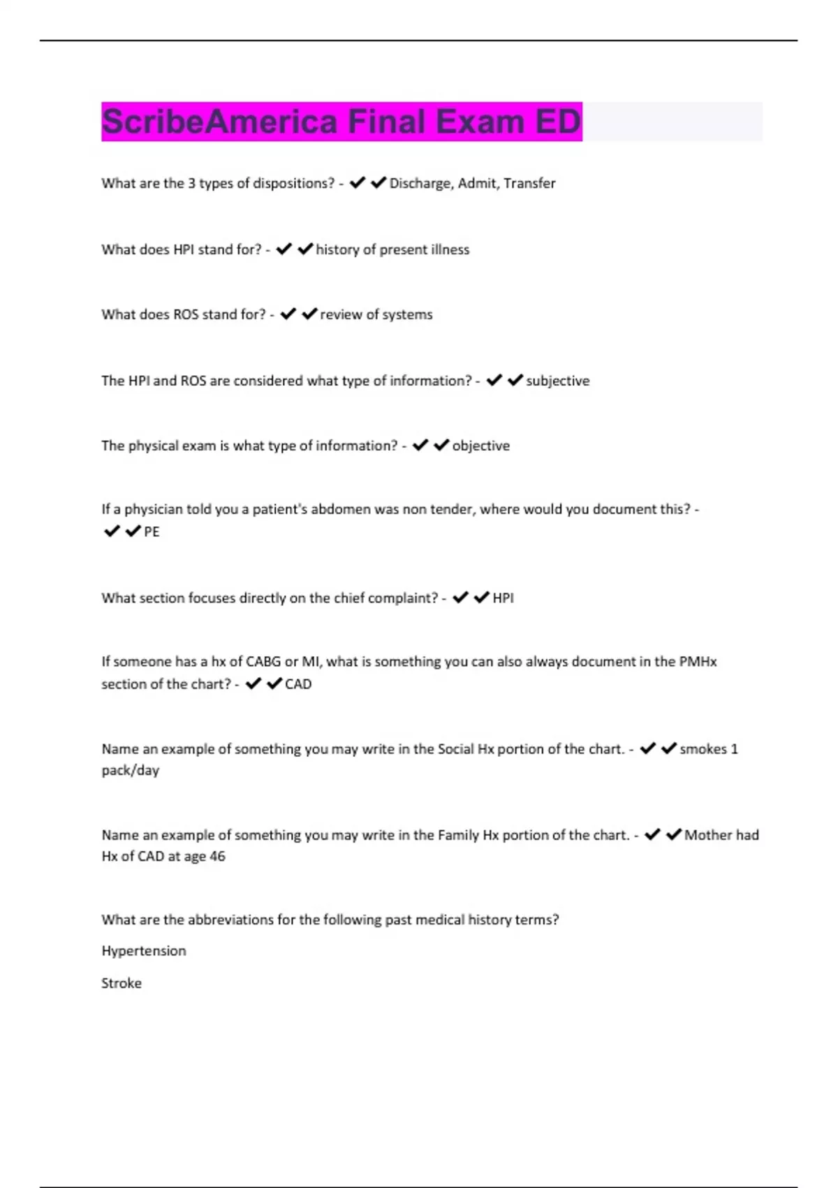 ScribeAmerica Final Exam ED Questions With Complete Answers 2024 update