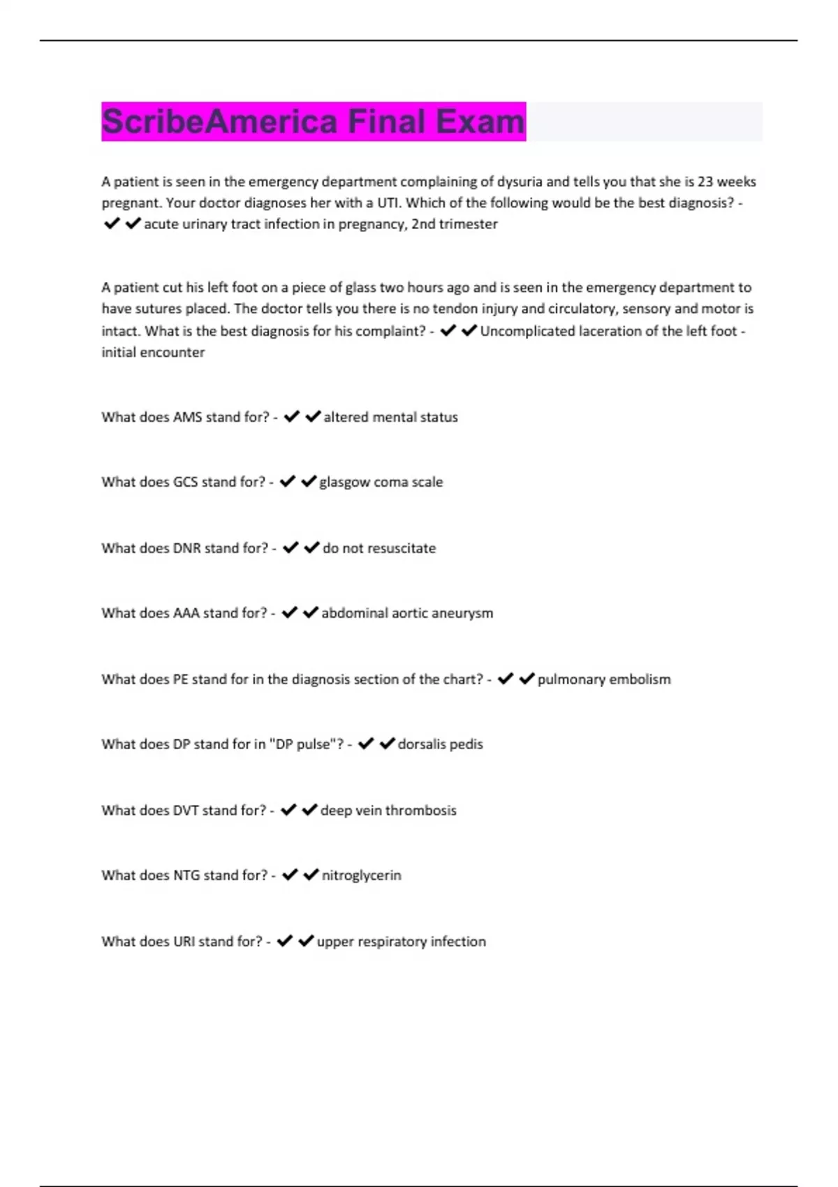 A patient is seen in the emergency department complaining of dysuria and tells you that she is 23 weeks pregnant. Your doctor diagnoses her with a UTI. Which of the following would be the best diagnosis? - acute urinary tract infection in pregnancy, 2nd trimester A patient cut his left foot on a piece of glass two hours ago and is seen in the emergency department to have sutures placed. The doctor tells you there is no tendon injury and circulatory, sensory and motor is intact. What is the best diagnosis for his complaint? - Uncomplicated laceration of the left foot - initial encounter What does AMS stand for? - altered mental status What does GCS stand for? - glasgow coma scale What does DNR stand for? - do not resuscitate What does AAA stand for? - abdominal aortic aneurysm What does PE stand for in the diagnosis section of the chart? - pulmonary embolism What does DP stand for in "DP pulse"? - dorsalis pedis What does DVT stand for? - deep vein thrombosis What does NTG stand for? - nitroglycerin What does URI stand for? - upper respiratory infectionWhat does CHF stand for? - congestive heart failure What does s/p stand for? - status post What does GERD stand for? - gastroesophageal reflux disease What does EOMI stand for? - extraocular movements intact What does DOE stand for? - dyspnea on exertion What does LBBB stand for? - left bundle branch block What does CVA stand for? - costovertebral angle What does CSF stand for? - cerebrospinal fluid What does PTX stand for? - pneumothorax What does COPD stand for? - chronic obstructive pulmonary disease What does PNA stand for? - pneumonia What does CBC stand for? - complete blood count What does IDDM stand for? - insulin dependent diabetes mellitus What does TIA stand for? - transient ischemic attackA 43 y/o male presents to the ED with vomiting that began 5 hours ago. He has a history of Type II DM and is s/p right BKA. On objective evaluation it is found that he is hyperglycemic and has elevated ketones and so he will be admitted for DKA. Match the details to the correct section of the chart. 5 hours ago, DKA, vomiting, admit, Type II DM, right BKA, hyperglycemia & elevated ketones, Onset: Disposition: ED Course: CC: PMHx: Diagnosis: PSHx: - Onset: 5 hours ago Disposition: admit ED Course: hyperglycemia and elevated ketones CC: vomiting PMHx: Type II DM Diagnosis: DKA PSHx: right BKA Match the following description to the appropriate team member. Unit Secretary, ED tech, Scribe, Mid-level Provider, charge nurse, RT, ED nurse ________: Documents the patient's visits on behalf of the physician ________: Answers phone calls, pages other specialists/ doctors, and organizes the patient's paperwork ________: Records medical histories, symptoms, monitors the patient, starts IVs, administers mediations, and assists with procedures________: Helps the nurse and assists with procedures ________: Administers "breathing treatments" and assists with managing a patient's airway ________: NP or PA that works under the supervision of a physician to diagnose and treat patients ________: Manages the ED patient flow - Scribe: Documents the patient's visits on behalf of the physician Unit Secretary: Answers phone calls, pages other specialists/ doctors, and organizes the patient's paperwork ED Nurse: Records medical histories, symptoms, monitors the patient, starts IVs, administers mediations, and assists with procedures ED Tech: Helps the nurse and assists with procedures RT: Administers "breathing treatments" and assists with managing a patient's airway Mid-Level Provider: NP or PA that works under the supervision of a physician to diagnose and treat patients Charge Nurse: Manages the ED patient flow T/F. It is the middle of the day. Your provider is busy dealing with a critical ill patient and during this time the ED Strats to pick up tase as more patients arrive. While your provider is prepping the critical patient for a procedure, she asks you to look up the CBC result on another patient. You quickly look up the information on your laptop and tell the physician that the labs came back normal except for a blood glucose level of 356, so your provider subsequently asks you to tell the nurse to start that patient on an insulin drip. You locate the nurse and relay the message. This scenario is acceptable and within the bounds of your scribe scope. - FalseWhich section of the chart would you find AKA? a. PSHx b. PMHx c. SHx d. Disposition e. FHx f. PE - PSHx PE Which of the following would be documented in ED Course? a. Physical Exam b. HPI c. Family History d. Re-evals e. Interpretations f. Orders g. Treatments h. Disposition note - Re-evals