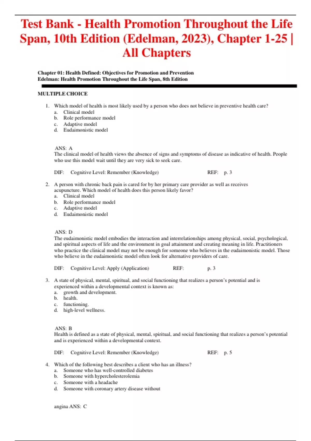 Test Bank - Health Promotion Throughout the Life Span, 10th Edition (Edelman, 2023), Chapter 1-25 | All Chapters Chapter 01: Health Defined: Objectives for Promotion and Prevention Edelman: Health Promotion Throughout the Life Span, 8th Edition MULTIPLE CHOICE 1. Which model of health is most likely used by a person who does not believe in preventive health care? a. Clinical model b. Role performance model c. Adaptive model d. Eudaimonistic model ANS: A The clinical model of health views the absence of signs and symptoms of disease as indicative of health. People who use this model wait until they are very sick to seek care. DIF: Cognitive Level: Remember (Knowledge) REF: p. 3 2. A person with chronic back pain is cared for by her primary care provider as well as receives acupuncture. Which model of health does this person likely favor? a. Clinical model b. Role performance model c. Adaptive model d. Eudaimonistic model ANS: D The eudaimonistic model embodies the interaction and interrelationships among physical, social, psychological, and spiritual aspects of life and the environment in goal attainment and creating meaning in life. Practitioners who practice the clinical model may not be enough for someone who believes in the eudaimonistic model. Those who believe in the eudaimonistic model often look for alternative providers of care. DIF: Cognitive Level: Apply (Application) REF: p. 3 3. A state of physical, mental, spiritual, and social functioning that realizes a person’s potential and is experienced within a developmental context is known as: a. growth and development. b. health. c. functioning. d. high-level wellness. ANS: B Health is defined as a state of physical, mental, spiritual, and social functioning that realizes a person’s potential and is experienced within a developmental context. DIF: Cognitive Level: Remember (Knowledge) REF: p. 5 4. Which of the following best describes a client who has an illness? a. Someone who has well-controlled diabetes b. Someone with hypercholesterolemia c. Someone with a headache d. Someone with coronary artery disease without angina ANS: C Someone with a headache represents a person with an illness. An illness is made up of the subjective experience of the individual and the physical manifestation of disease. It can be described as a response characterized by a mismatch between a person’s needs and the resources available to meet those needs. A person can have a disease without feeling ill. The other choices represent disease. DIF: Cognitive Level: Analyze (Analysis) REF: p. 6 5. Which US report is considered a landmark document in creating a global approach to health? a. The 1990 Health Objectives for the Nation: A Midcourse Review b. Healthy People 2020 c. Healthy People 2000 d. The U.S. Surgeon General Report ANS: C Healthy People 2000 and its Midcourse Review and 1995 Revisions were landmark documents in which a consortium of people representing national organizations worked with US Public Health Service officials to create a more global approach to health. DIF: Cognitive Level: Remember (Knowledge)