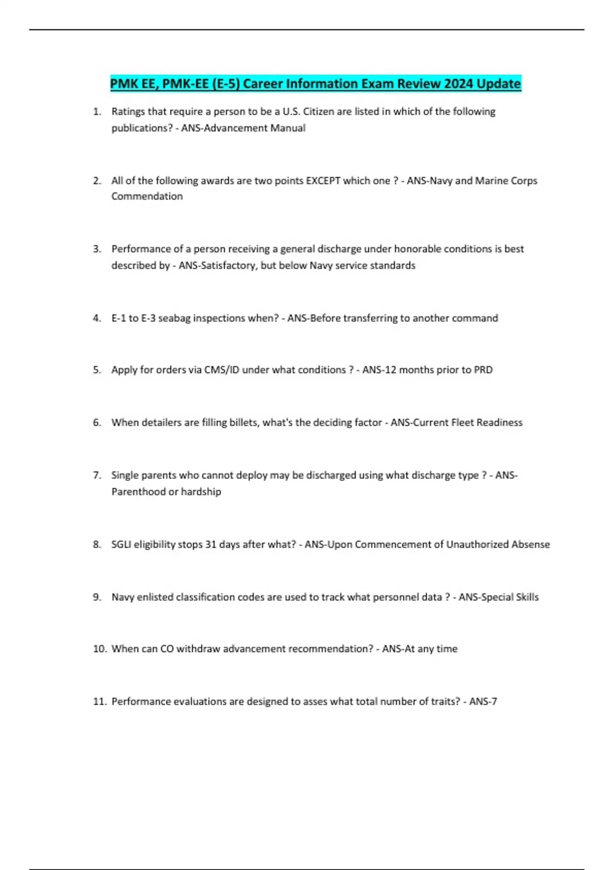 PMK EE, PMK-EE (E-5) Career Information Exam Review 2024 Update 1. Ratings that require a person to be a U.S. Citizen are listed in which of the following publications? - ANS-Advancement Manual 2. All of the following awards are two points EXCEPT which one ? - ANS-Navy and Marine Corps Commendation 3. Performance of a person receiving a general discharge under honorable conditions is best described by - ANS-Satisfactory, but below Navy service standards 4. E-1 to E-3 seabag inspections when? - ANS-Before transferring to another command 5. Apply for orders via CMS/ID under what conditions ? - ANS-12 months prior to PRD 6. When detailers are filling billets, what's the deciding factor - ANS-Current Fleet Readiness 7. Single parents who cannot deploy may be discharged using what discharge type ? - ANSParenthood or hardship 8. SGLI eligibility stops 31 days after what? - ANS-Upon Commencement of Unauthorized Absense 9. Navy enlisted classification codes are used to track what personnel data ? - ANS-Special Skills 10. When can CO withdraw advancement recommendation? - ANS-At any time 11. Performance evaluations are designed to asses what total number of traits? - A