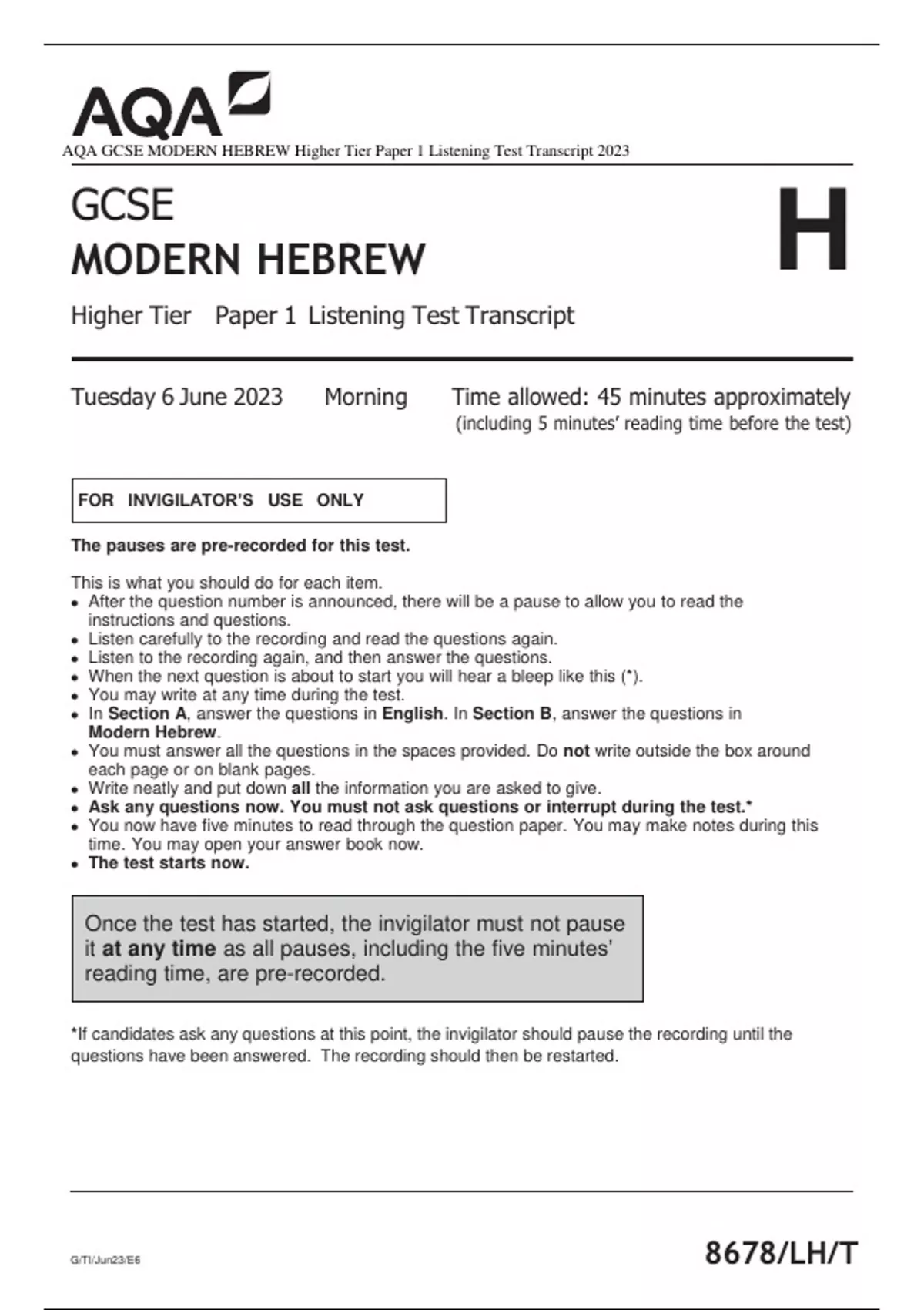AQA GCSE MODERN HEBREW Higher Tier Paper 1 Listening Test Transcript 2023