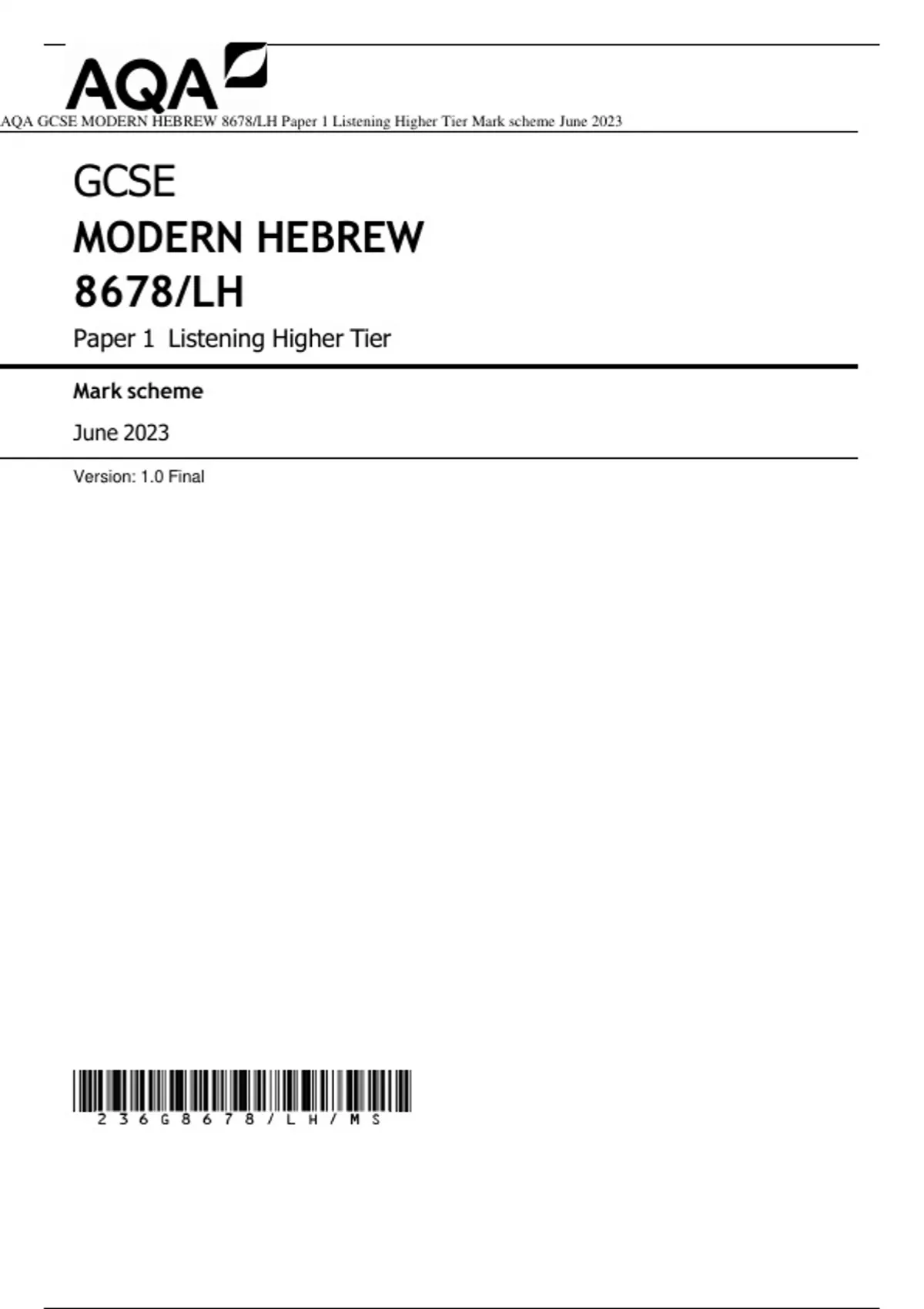 AQA GCSE MODERN HEBREW 8678/LH Paper 1 Listening Higher Tier Mark scheme June 2023
