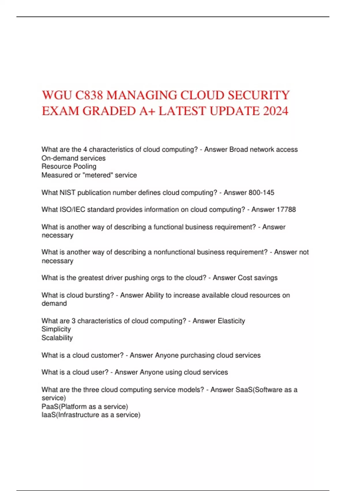 WGU C838 MANAGING CLOUD SECURITY EXAM GRADED A+ LATEST UPDATE 2024 WGU C838 MANAGING CLOUD SECURITY EXAM GRADED A+ LATEST UPDATE 2024 WGU C838 MANAGING CLOUD SECURITY EXAM GRADED A+ LATEST UPDATE 2024