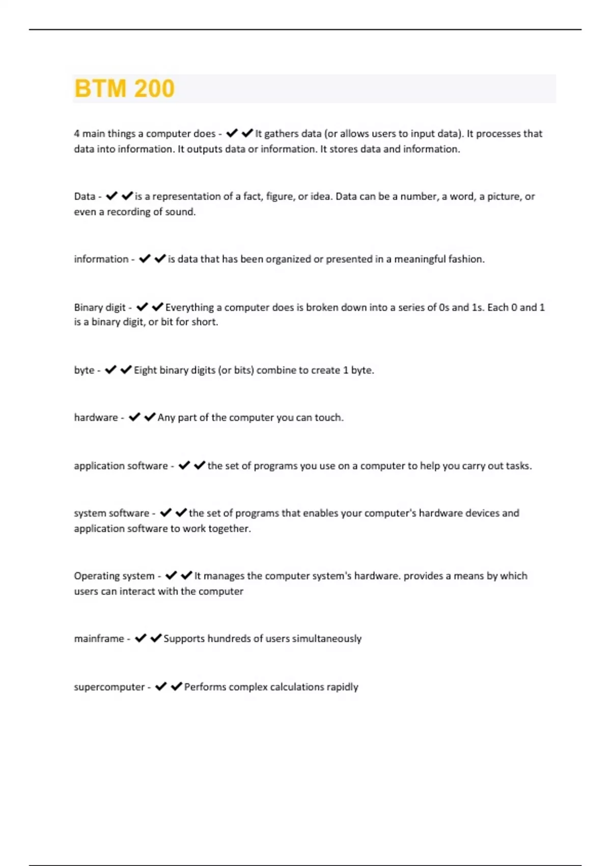4 main things a computer does - It gathers data (or allows users to input data). It processes that data into information. It outputs data or information. It stores data and information. Data - is a representation of a fact, figure, or idea. Data can be a number, a word, a picture, or even a recording of sound. information - is data that has been organized or presented in a meaningful fashion. Binary digit - Everything a computer does is broken down into a series of 0s and 1s. Each 0 and 1 is a binary digit, or bit for short. byte - Eight binary digits (or bits) combine to create 1 byte. hardware - Any part of the computer you can touch. application software - the set of programs you use on a computer to help you carry out tasks. system software - the set of programs that enables your computer's hardware devices and application software to work together. Operating system - It manages the computer system's hardware. provides a means by which users can interact with the computer mainframe - Supports hundreds of users simultaneously supercomputer - Performs complex calculations rapidlyembedded - Self-contained computer performing dedicated functions input device - enables you to enter data (text, images and sounds) and instructions (user responses and commands) into the computer. Keyboards and mouse. Magnifier - Pulls up a magnification box that you can drag around the screen to enhance the viewing of hard-to-read images. This feature can be used by people with visual disabilities. customizable buttons - Extra buttons on the mouse can be programmed to perform the functions you use most often to help you speed through tasks. web search - Allows you to quickly highlight a word or phrase and then press the search button (on the mouse) to start a Web search. file storage - Includes a wireless USB receiver that contains flash memory to store or back up your files (for example, a USB drive). output devices - enable you to send processed data out of your computer. pictures and sound Soft copies - video, sound Hard copies - print LCD - Liquid crystal display LED - Light-emitting diode aspect ratio - The width-to-height proportion of a monitor.Contrast ratio - A measure of the difference in light intensity between the brightest white and the darkest black that the monitor can produce