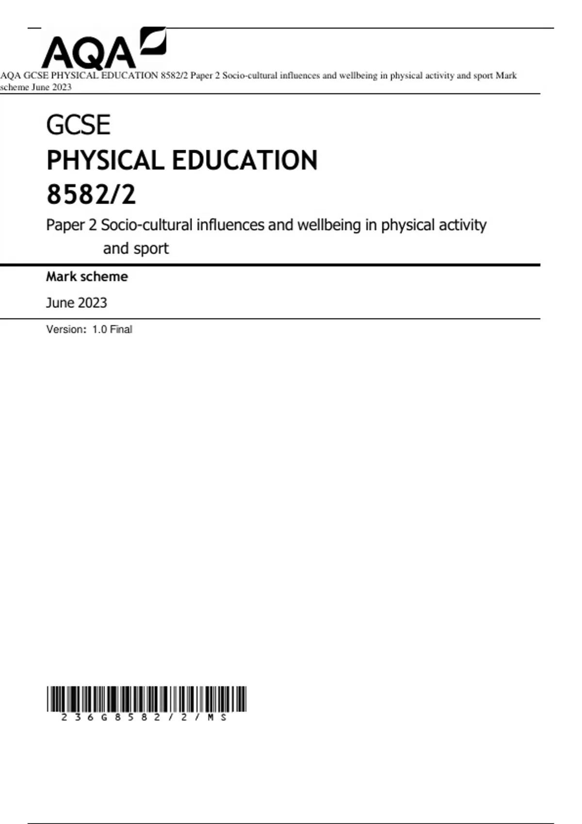 AQA GCSE PHYSICAL EDUCATION Paper 2 Socio-cultural influences and wellbeing in physical activity and sport QP and MS 2023