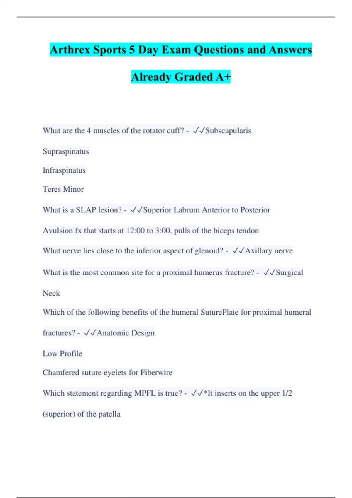 Arthrex Sports 5 Day Exam Questions and Answers Already Graded A+