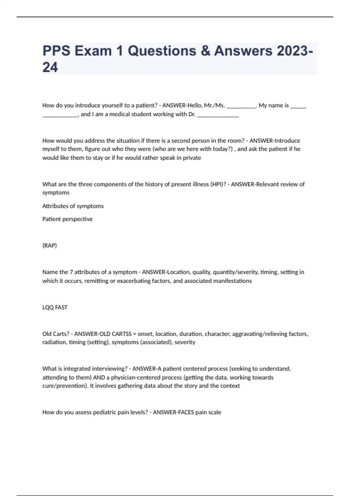 PPS Exam 1 Questions & Answers 2023-24 How do you introduce yourself to a patient? - ANSWER-Hello, Mr./Ms. _________. My name is _____ ___________, and I am a medical student working with Dr. _____________ How would you address the situation if there is a second person in the room? - ANSWER-Introduce myself to them, figure out who they were (who are we here with today?) , and ask the patient if he would like them to stay or if he would rather speak in private What are the three components of the history of present illness (HPI)? - ANSWER-Relevant review of symptoms Attributes of symptoms Patient perspective (RAP) Name the 7 attributes of a symptom - ANSWER-Location, quality, quantity/severity, timing, setting in which it occurs, remitting or exacerbating factors, and associated manifestations LQQ FAST Old Carts? - ANSWER-OLD CARTSS = onset, location, duration, character, aggravating/relieving factors, radiation, timing (setting), symptoms (associated), severity What is integrated interviewing? - ANSWER-A patient centered process (seeking to understand, attending to them) AND a physician-centered process (getting the data, working towards cure/prevention). It involves gathering data about the story and the context How do you assess pediatric pain levels? - ANSWER-FACES pain scale