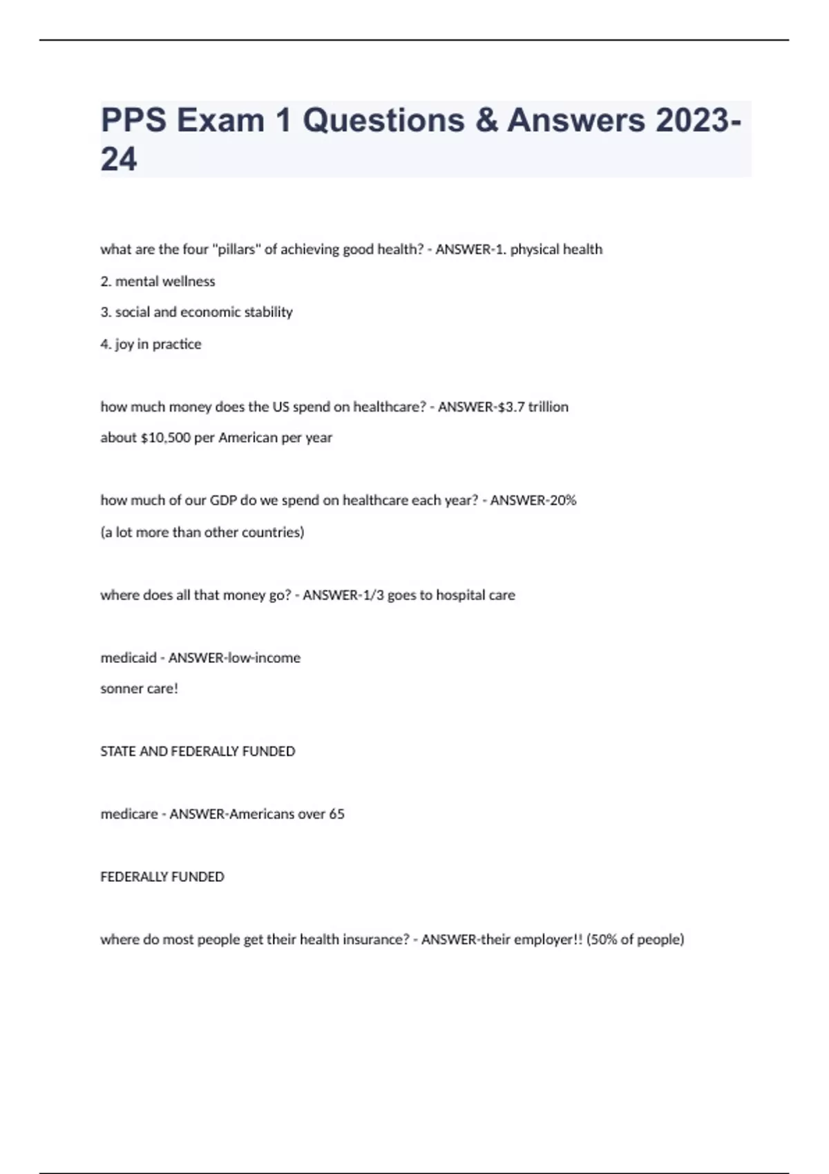 PPS Exam 1 Questions & Answers 2023-24 what are the four "pillars" of achieving good health? - ANSWER-1. physical health 2. mental wellness 3. social and economic stability 4. joy in practice how much money does the US spend on healthcare? - ANSWER-$3.7 trillion about $10,500 per American per year how much of our GDP do we spend on healthcare each year? - ANSWER-20% (a lot more than other countries) where does all that money go? - ANSWER-1/3 goes to hospital care medicaid - ANSWER-low-income sonner care! STATE AND FEDERALLY FUNDED medicare - ANSWER-Americans over 65 FEDERALLY FUNDED where do most people get their health insurance? - ANSWER-their employer!! (50% of people)