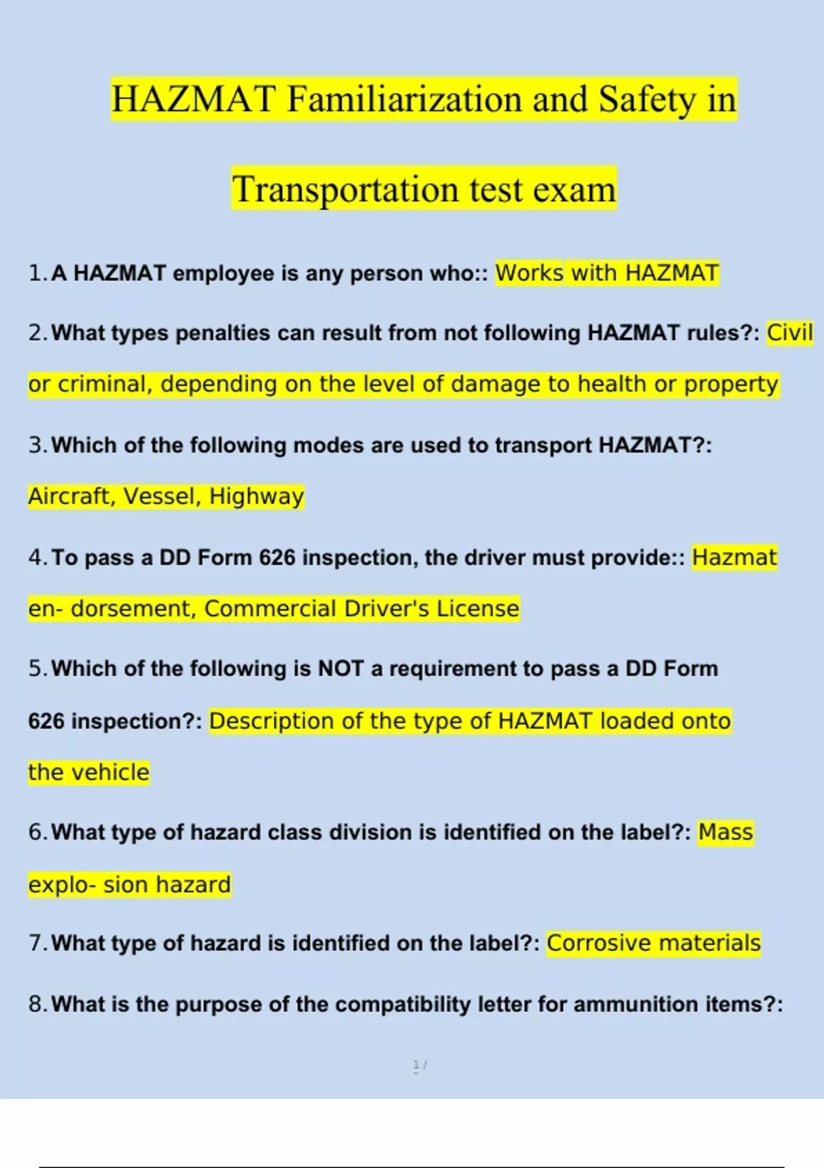 Hazmat Familiarization and Safety In Transportation STUDY BUNDLE PACK SOLUTION (Questions and Answers )(2023/2024) (Verified Answers)