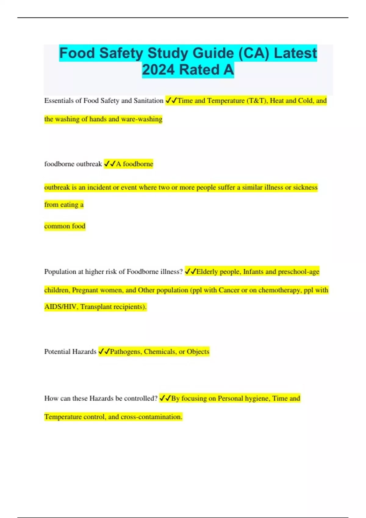 Food Safety Study Guide (CA) Latest 2024 Rated A