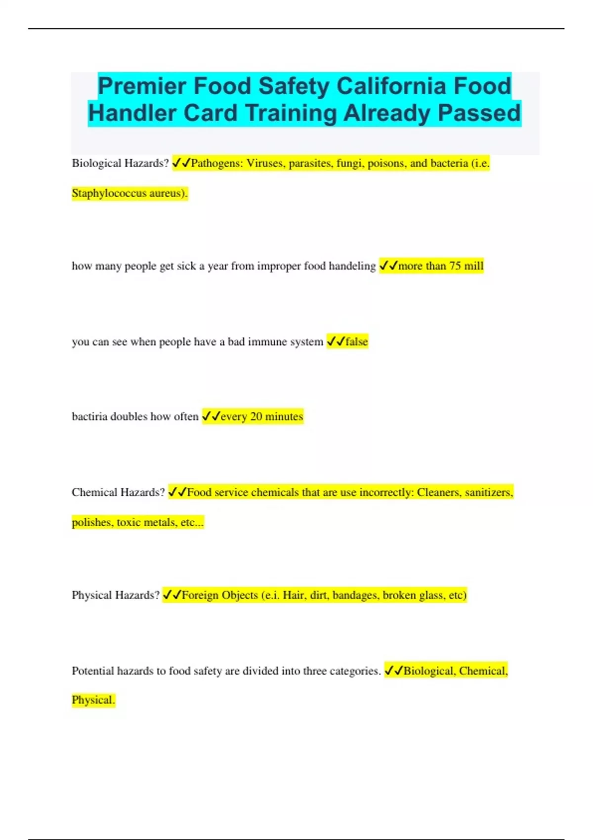 Premier Food Safety California Food Handler Card Training Already Passed Biological Hazards? Pathogens: Viruses, parasites, fungi, poisons, and bacteria (i.e. Staphylococcus aureus). how many people get sick a year from improper food handeling more than 75 mill you can see when people have a bad immune system false bactiria doubles how often every 20 minutes Chemical Hazards? Food service chemicals that are use incorrectly: Cleaners, sanitizers, polishes, toxic metals, etc... Physical Hazards? Foreign Objects (e.i. Hair, dirt, bandages, broken glass, etc) Potential hazards to food safety are divided into three categories. Biological, Chemical, Physical. Potential Hazards Pathogens, Chemicals, or Objects is it a state requirement to wear gloves for food preparation? no but hands need to cleaned in the proper way if i am sick can i still work? depends. if vomiting, dirrahea, jondance, yes they need to be sent home. fifo first in first out, which ever comes in first is used first and that is how you should store it all the following are examples of dry goods except -fresh or frozen ground beef -cereal -dry pasta -soup crackers fresh or frozen ground beef can i put hot food directly into the refrigerator or freezer? no, the hot food needs to cool down to proper temperatures before storing what is one piece of equipment every food establishment needs, to ensure that food is cooked safely? bi-metallic stemmed thermometer when should thermometers be calibrated? when taking measurements between extreme temperature ranges there are specific methods to measuring the temp readings of packaged and unpackaged food true all the following are improper methods or serving food except -holding plates from the bottom -holding plates from the sides with thumbs on the plate surface -holding cups from the top of the glass -eating food while serving holding plates from the bottom