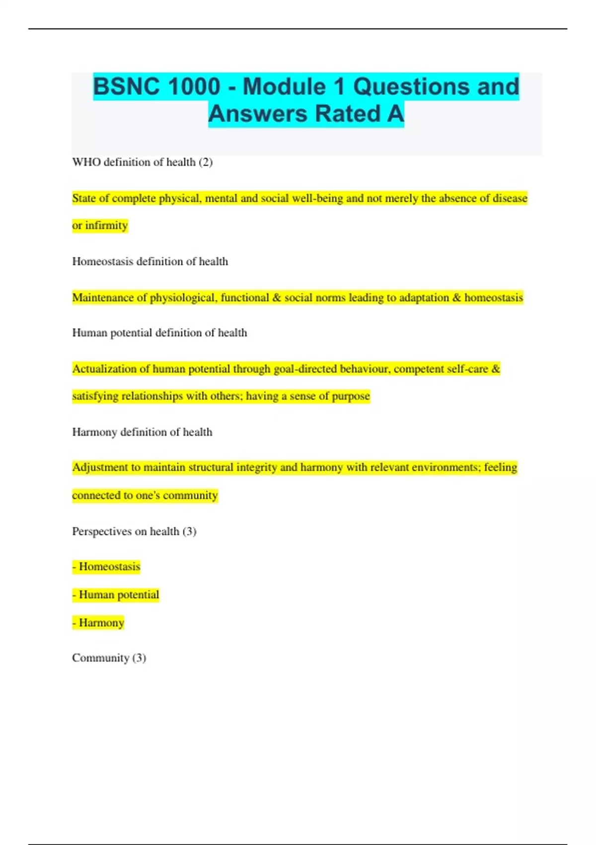 BSNC 1000 - Module 1 Questions and Answers Rated A WHO definition of health (2) State of complete physical, mental and social well-being and not merely the absence of disease or infirmity Homeostasis definition of health Maintenance of physiological, functional & social norms leading to adaptation & homeostasis Human potential definition of health Actualization of human potential through goal-directed behaviour, competent self-care & satisfying relationships with others; having a sense of purpose Harmony definition of health Adjustment to maintain structural integrity and harmony with relevant environments; feeling connected to one's community Perspectives on health (3) - Homeostasis - Human potential - Harmony Community (3) - defined be geography, common interest, political boundaries - composed of several populations - can be seen as a 'client' Population (2) - collection of individuals living in the same place who have at least one characteristic in common - e.g., BCIT students Aggregate (2) - subpopulation or group within a larger population - e.g., students in a BSN program Population health (4) - measured by determinants of health &; health status indicators - an approach to health that aims to improve the health of an entire population and looking at inequities in terms of health - improves the health of populations & and decreases inequities - 4 subconcepts and scope consists of 5 elements (clients) Subconcepts of population health (4) - health promotion - illness and injury prevention - chronic disease management - epidemiology Scope of population health (5) - individuals - groups - families - communities - populations Health promotion (3) - specific program (e.g., child immunization) - includes health, wellness, disease, illness - prevention of injury or disease that uses critical thinking to create change Determinants of health The factors that influence the risk for or distribution of health outcomes List of determinants of health Income and social status Employment and working conditions Education and literacy Childhood experiences Physical environments Social supports and coping skills Healthy behaviours Access to health services Biology and genetic endowment Gender Culture Race / Racism Social determinants