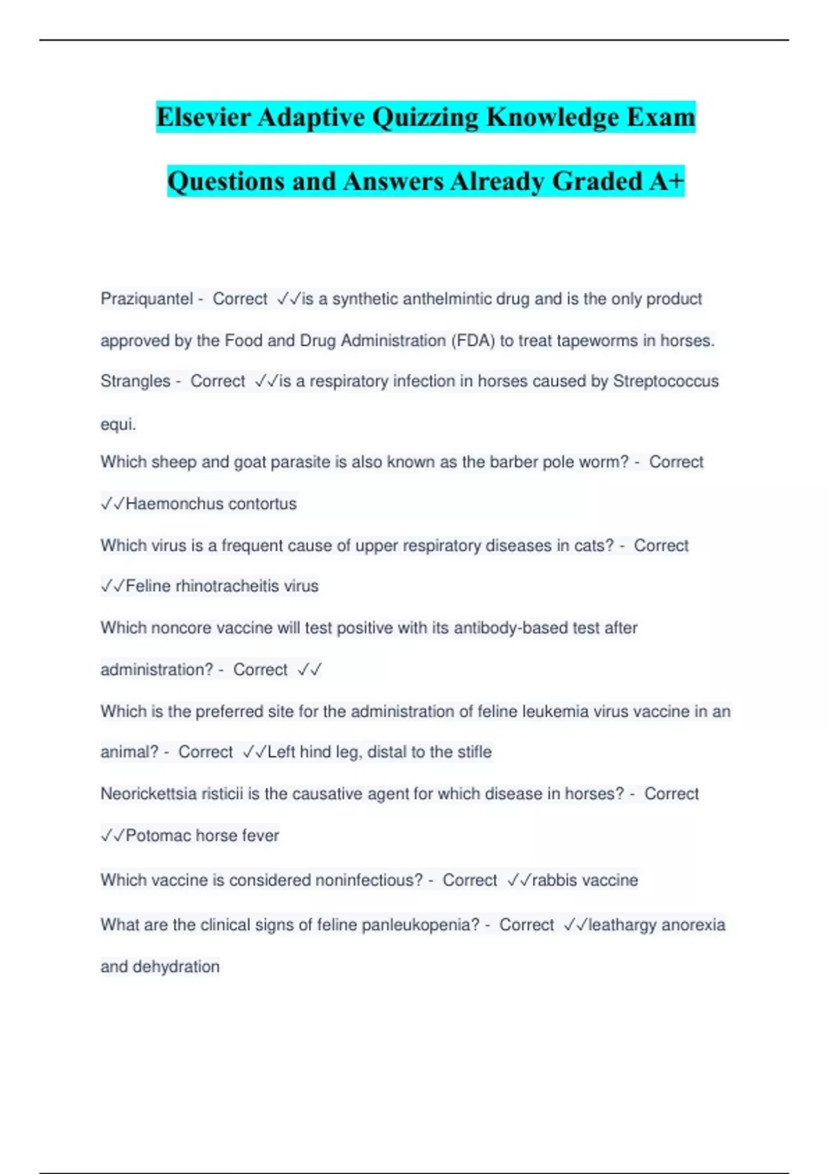 Praziquantel - Correct is a synthetic anthelmintic drug and is the only product approved by the Food and Drug Administration (FDA) to treat tapeworms in horses. Strangles - Correct is a respiratory infection in horses caused by Streptococcus equi. Which sheep and goat parasite is also known as the barber pole worm? - Correct Haemonchus contortus Which virus is a frequent cause of upper respiratory diseases in cats? - Correct Feline rhinotracheitis virus Which noncore vaccine will test positive with its antibody-based test after administration? - Correct Which is the preferred site for the administration of feline leukemia virus vaccine in an animal? - Correct Left hind leg, distal to the stifle Neorickettsia risticii is the causative agent for which disease in horses? - Correct Potomac horse fever Which vaccine is considered noninfectious? - Correct rabbis vaccine What are the clinical signs of feline panleukopenia? - Correct leathargy anorexia and dehydration