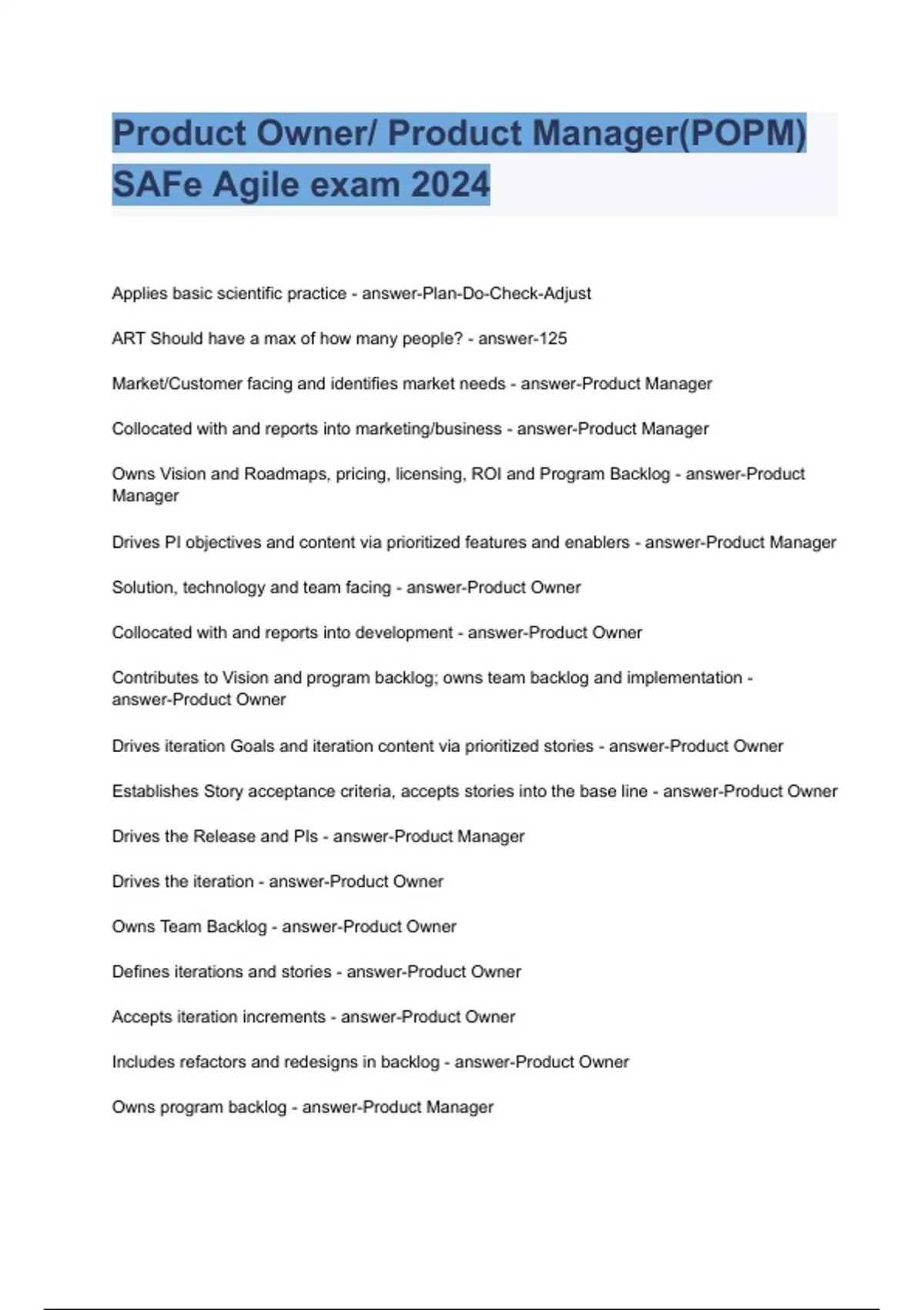 Product Owner/ Product Manager(POPM) SAFe Agile exam 2024