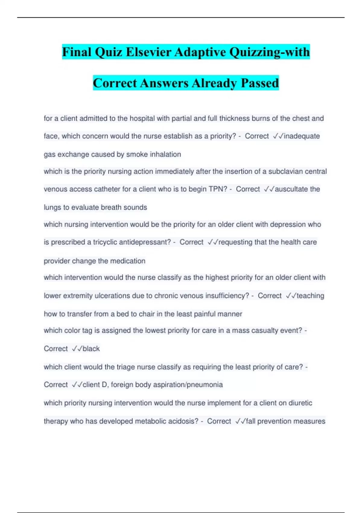 Final Quiz Elsevier Adaptive Quizzing-with Correct Answers Already Passed