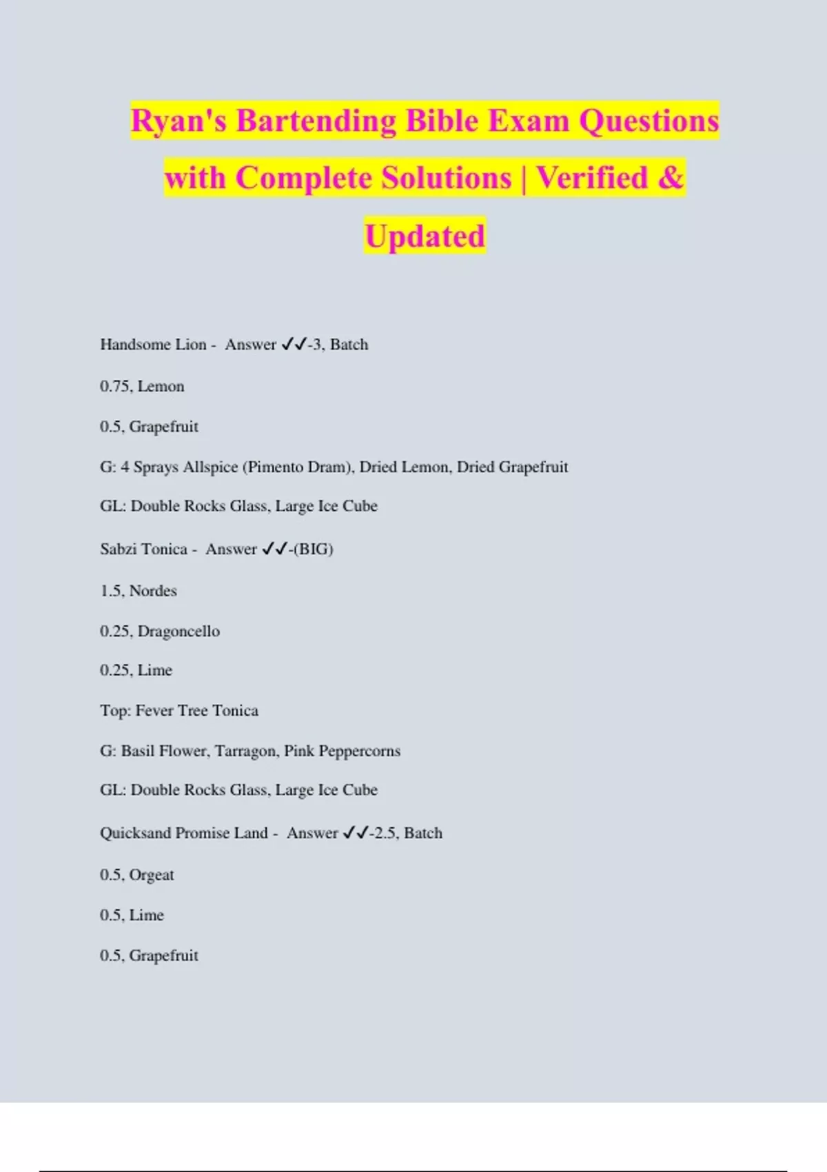 Ryan's Bartending Bible Exam Questions with Complete Solutions | Verified & Updated Handsome Lion - Answer ️️ -3, Batch 0.75, Lemon 0.5, Grapefruit G: 4 Sprays Allspice (Pimento Dram), Dried Lemon, Dried Grapefruit GL: Double Rocks Glass, Large Ice Cube Sabzi Tonica - Answer ️️ -(BIG) 1.5, Nordes 0.25, Dragoncello 0.25, Lime Top: Fever Tree Tonica G: Basil Flower, Tarragon, Pink Peppercorns GL: Double Rocks Glass, Large Ice Cube Quicksand Promise Land - Answer ️️ -2.5, Batch 0.5, Orgeat 0.5, Lime 0.5, Grapefruit G: Mint Spring, Lime Butt w/ OFTD (Overproof Rum & Lemon Oil) GL: Double Rocks Glass, Shaved Ice Deep Sea Diver - Answer ️️ -1.5, Batch 1.5, Rocktown 0.75, Lemon G: Boba Pearls and 4-6 Sprays Angostura Bitters GL: Coupe Shazdeh Garden - Answer ️️ -1.5, Batch 1.5, Rocktown 0.75, Lime G: Peaflower Extract Spray, Elderberry Powder, Borage Flower GL: Coupe Skeleton Tree - Answer ️️ -(STIRRED) 3, Batch G: Luxardo Cherry, Skeleton Flower Pe