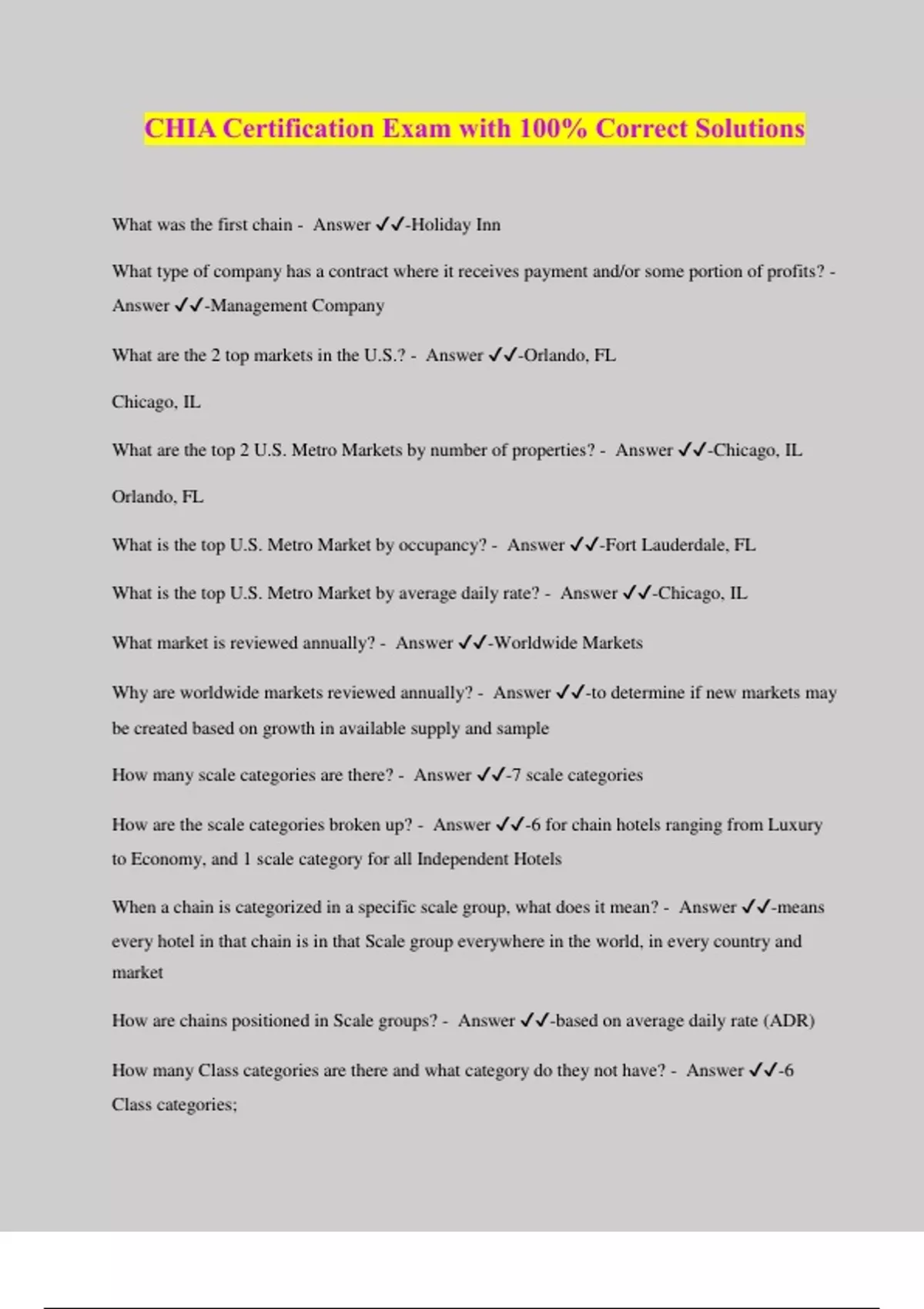 CHIA Certification Exam with 100% Correct Solutions What was the first chain - Answer ️️ -Holiday Inn What type of company has a contract where it receives payment and/or some portion of profits? - Answer ️️ -Management Company What are the 2 top markets in the U.S.? - Answer ️️ -Orlando, FL Chicago, IL What are the top 2 U.S. Metro Markets by number of properties? - Answer ️️ -Chicago, IL Orlando, FL What is the top U.S. Metro Market by occupancy? - Answer ️️ -Fort Lauderdale, FL What is the top U.S. Metro Market by average daily rate? - Answer ️️ -Chicago, IL What market is reviewed annually? - Answer ️️ -Worldwide Markets Why are worldwide markets reviewed annually? - Answer ️️ -to determine if new markets may be created based on growth in available supply and sample How many scale categories are there? - Answer ️️ -7 scale categories How are the scale categories broken up? - Answer ️️ -6 for chain hotels ranging from Luxury to Economy, and 1 scale category for all Independent Hotels When a chain is categorized in a specific scale group, what does it mean? - Answer ️️ -means every hotel in that chain is in that Scale group everywhere in the world, in every country and market How are chains positioned in Scale groups? - Answer ️️ -based on average daily rate (ADR) How many Class categories are there and what category do they not have? - Answer ️️ -6 Class categories;