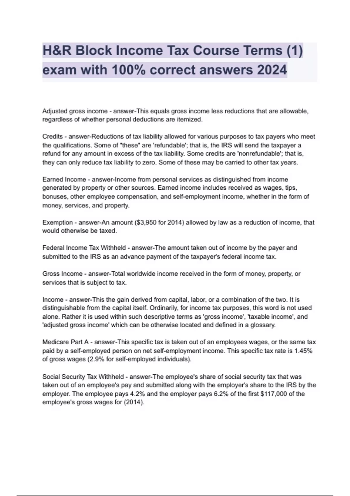 H&R Block Income Tax Course Terms (1) exam with 100% correct answers 2024