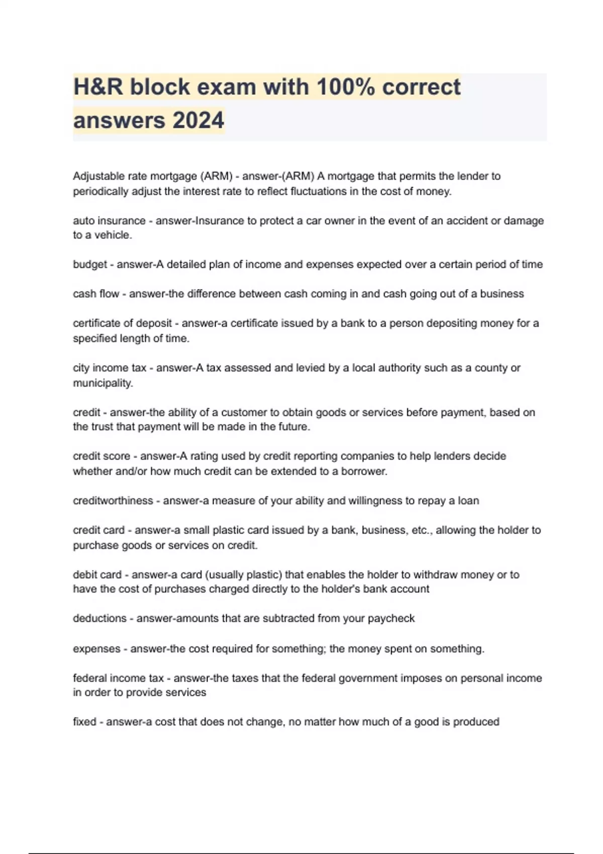 H&R block exam with 100% correct answers 2024
