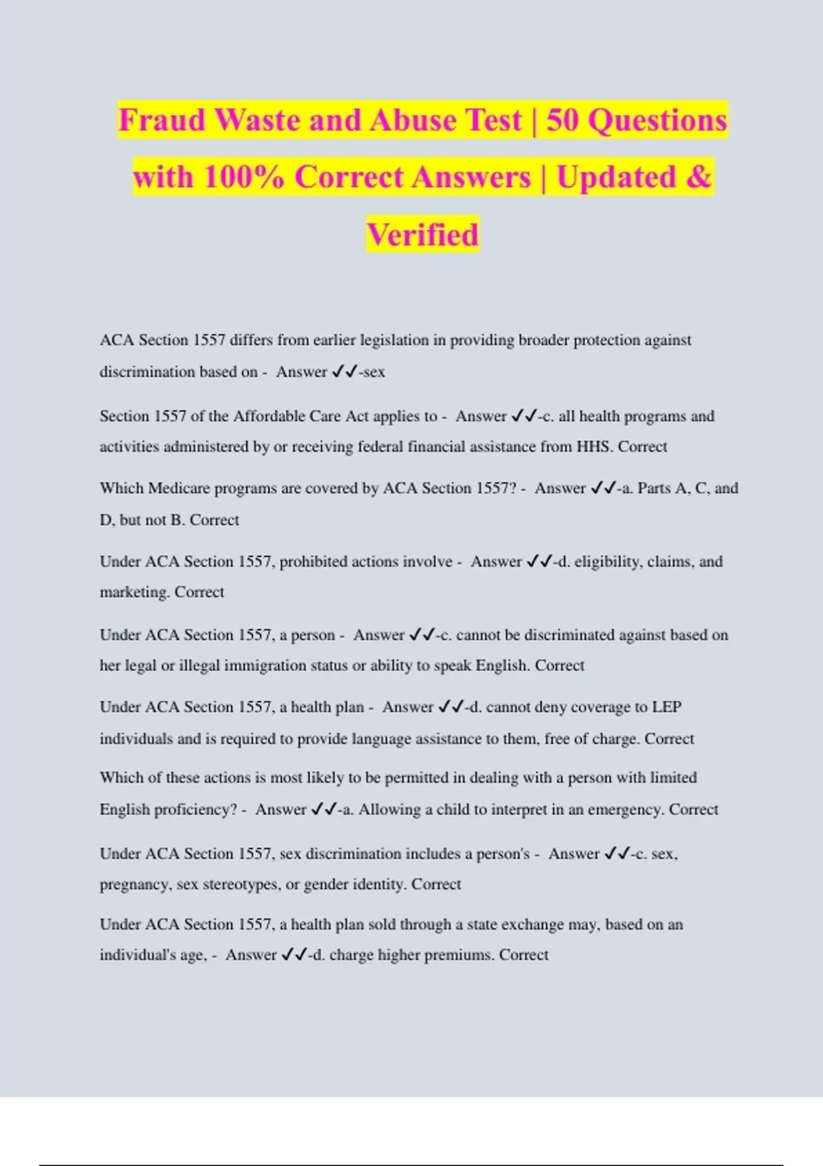 Fraud Waste and Abuse Test | 50 Questions with 100% Correct Answers | Updated & Verified ACA Section 1557 differs from earlier legislation in providing broader protection against discrimination based on - Answer ️️ -sex Section 1557 of the Affordable Care Act applies to - Answer ️️ -c. all health programs and activities administered by or receiving federal financial assistance from HHS. Correct Which Medicare programs are covered by ACA Section 1557? - Answer ️️ -a. Parts A, C, and D, but not B. Correct Under ACA Section 1557, prohibited actions involve - Answer ️️ -d. eligibility, claims, and marketing. Correct Under ACA Section 1557, a person - Answer ️️ -c. cannot be discriminated against based on her legal or illegal immigration status or ability to speak English. Correct Under ACA Section 1557, a health plan - Answer ️️ -d. cannot deny coverage to LEP individuals and is required to provide language assistance to them, free of charge. Correct Which of these actions is most likely to be permitted in dealing with a person with limited English proficiency? - Answer ️️ -a. Allowing a child to interpret in an emergency. Correct Under ACA Section 1557, sex discrimination includes a person's - Answer ️️ -c. sex, pregnancy, sex stereotypes, or gender identity. Correct Under ACA Section 1557, a health plan sold through a state exchange may, based on an individual's age, - Answer ️️ -d. charge higher premiums. Correc