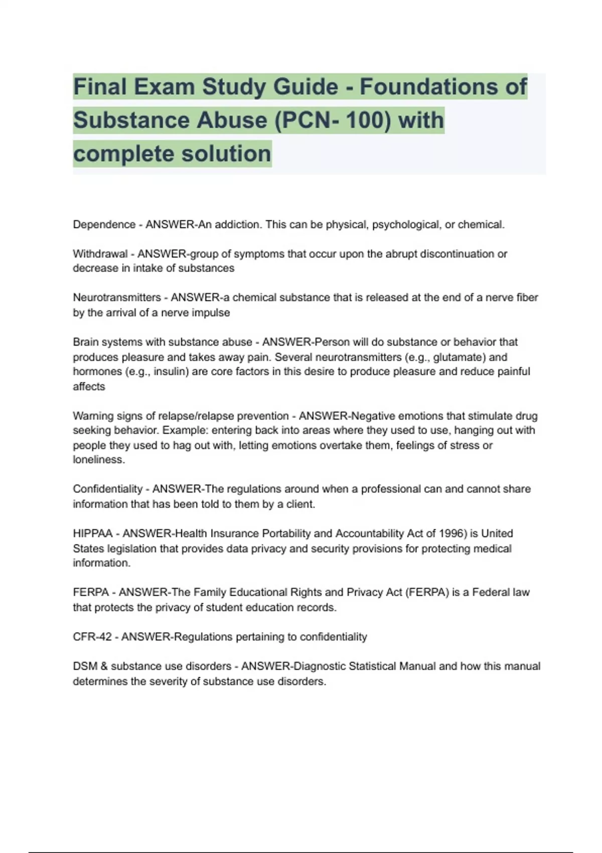 Final Exam Study Guide - Foundations of Substance Abuse (PCN- 100) with complete solution