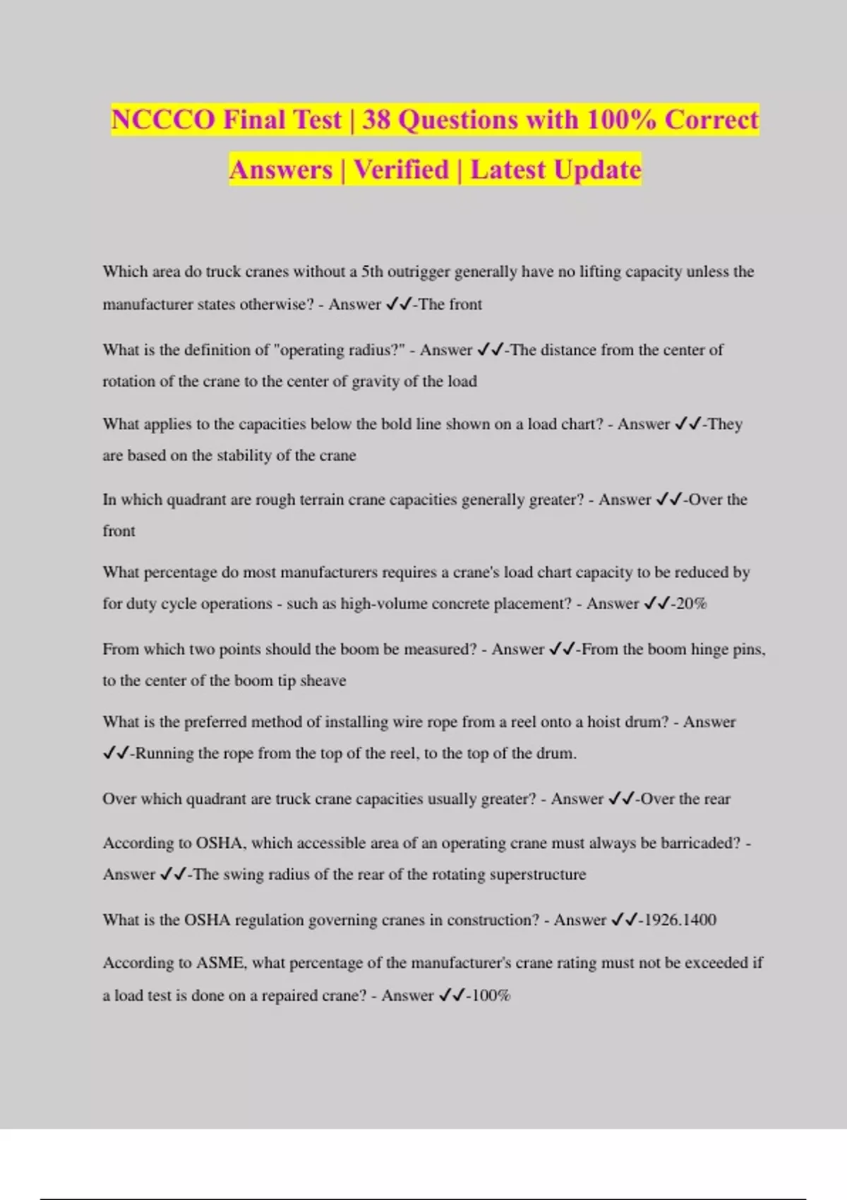 NCCCO Final Test | 38 Questions with 100% Correct Answers | Verified | Latest Update Which area do truck cranes without a 5th outrigger generally have no lifting capacity unless the manufacturer states otherwise? - Answer ️️ -The front What is the definition of "operating radius?" - Answer ️️ -The distance from the center of rotation of the crane to the center of gravity of the load What applies to the capacities below the bold line shown on a load chart? - Answer ️️ -They are based on the stability of the crane In which quadrant are rough terrain crane capacities generally greater? - Answer ️️ -Over the front What percentage do most manufacturers requires a crane's load chart capacity to be reduced by for duty cycle operations - such as high-volume concrete placement? - Answer ️️ -20% From which two points should the boom be measured? - Answer ️️ -From the boom hinge pins, to the center of the boom tip sheave What is the preferred method of installing wire rope from a reel onto a hoist drum? - Answer ️️ -Running the rope from the top of the reel, to the top of the drum. Over which quadrant are truck crane capacities usually greater? - Answer ️️ -Over the rear According to OSHA, which accessible area of an operating crane must always be barricaded? - Answer ️️ -The swing radius of the rear of the rotating superstructure What is the OSHA regulation governing cranes in construction? - Answer ️️ -1926.1400 According to ASME, what percentage of the manufacturer's crane rating must not be exceeded if a load test is done on a repaired crane? - Answer ️️ -100%