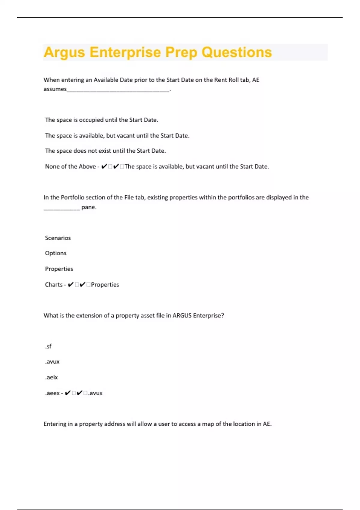 When entering an Available Date prior to the Start Date on the Rent Roll tab, AE assumes_______________________________. The space is occupied until the Start Date. The space is available, but vacant until the Start Date. The space does not exist until the Start Date. None of the Above - ️️The space is available, but vacant until the Start Date. In the Portfolio section of the File tab, existing properties within the portfolios are displayed in the ___________ pane. Scenarios Options Properties Charts - ️️Properties What is the extension of a property asset file in ARGUS Enterprise? .sf .avux .aeix .aeex - ️️.avux Entering in a property address will allow a user to access a map of the location in AE.