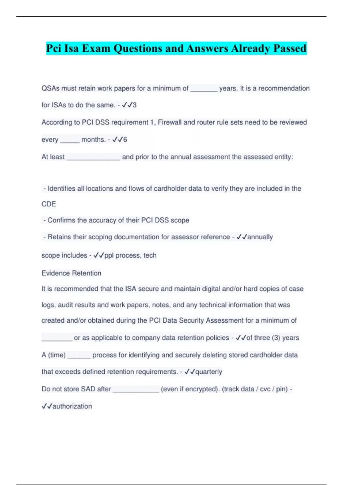 QSAs must retain work papers for a minimum of _______ years. It is a recommendation for ISAs to do the same. - ️️3 According to PCI DSS requirement 1, Firewall and router rule sets need to be reviewed every _____ months. - ️️6 At least ______________ and prior to the annual assessment the assessed entity: - Identifies all locations and flows of cardholder data to verify they are included in the CDE - Confirms the accuracy of their PCI DSS scope - Retains their scoping documentation for assessor reference - ️️annually scope includes - ️️ppl process, tech Evidence Retention It is recommended that the ISA secure and maintain digital and/or hard copies of case logs, audit results and work papers, notes, and any technical information that was created and/or obtained during the PCI Data Security Assessment for a minimum of ________ or as applicable to company data retention policies - ️️of three (3) years A (time) ______ process for identifying and securely deleting stored cardholder data that exceeds defined retention requirements. - ️️quarterly Do not store SAD after ____________ (even if encrypted). (track data / cvc / pin) - ️️authorization