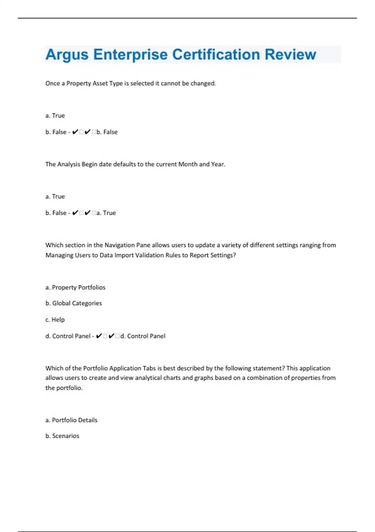 Once a Property Asset Type is selected it cannot be changed. a. True b. False - ️️b. False The Analysis Begin date defaults to the current Month and Year. a. True b. False - ️️a. True Which section in the Navigation Pane allows users to update a variety of different settings ranging from Managing Users to Data Import Validation Rules to Report Settings? a. Property Portfolios b. Global Categories c. Help d. Control Panel - ️️d. Control Panel Which of the Portfolio Application Tabs is best described by the following statement? This application allows users to create and view analytical charts and graphs based on a combination of properties from the portfolio. a. Portfolio Details b. Scenarios