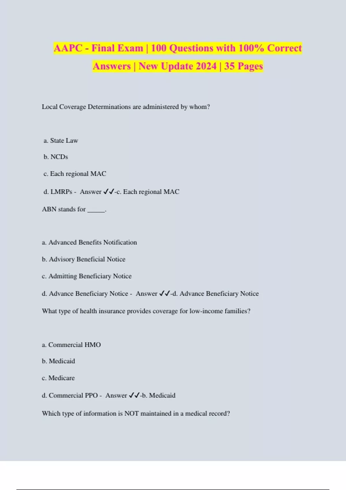 AAPC - Final Exam | 100 Questions with 100% Correct Answers | New Update 2024 | 35 Pages Local Coverage Determinations are administered by whom? a. State Law b. NCDs c. Each regional MAC d. LMRPs - Answer ️️ -c. Each regional MAC ABN stands for _____. a. Advanced Benefits Notification b. Advisory Beneficial Notice c. Admitting Beneficiary Notice d. Advance Beneficiary Notice - Answer ️️ -d. Advance Beneficiary Notice What type of health insurance provides coverage for low-income families? a. Commercial HMO b. Medicaid c. Medicare d. Commercial PPO - Answer ️️ -b. Medicaid Which type of information is NOT maintained in a medical record? a. Treatment outcomes b. Financial records c. Medical or surgical interventions d. Observations - Answer ️️ -b. Financial records According to the OIG, internal monitoring and auditing should be performed by what means? a. Focused audits on problems brought to the attention of the compliance officer. b. Baseline audits. c. Periodic audits. d. Audits on all denied claims. - Answer ️️ -c. Periodic audits. Urine is transported from the kidneys to the urinary bladder by which structu