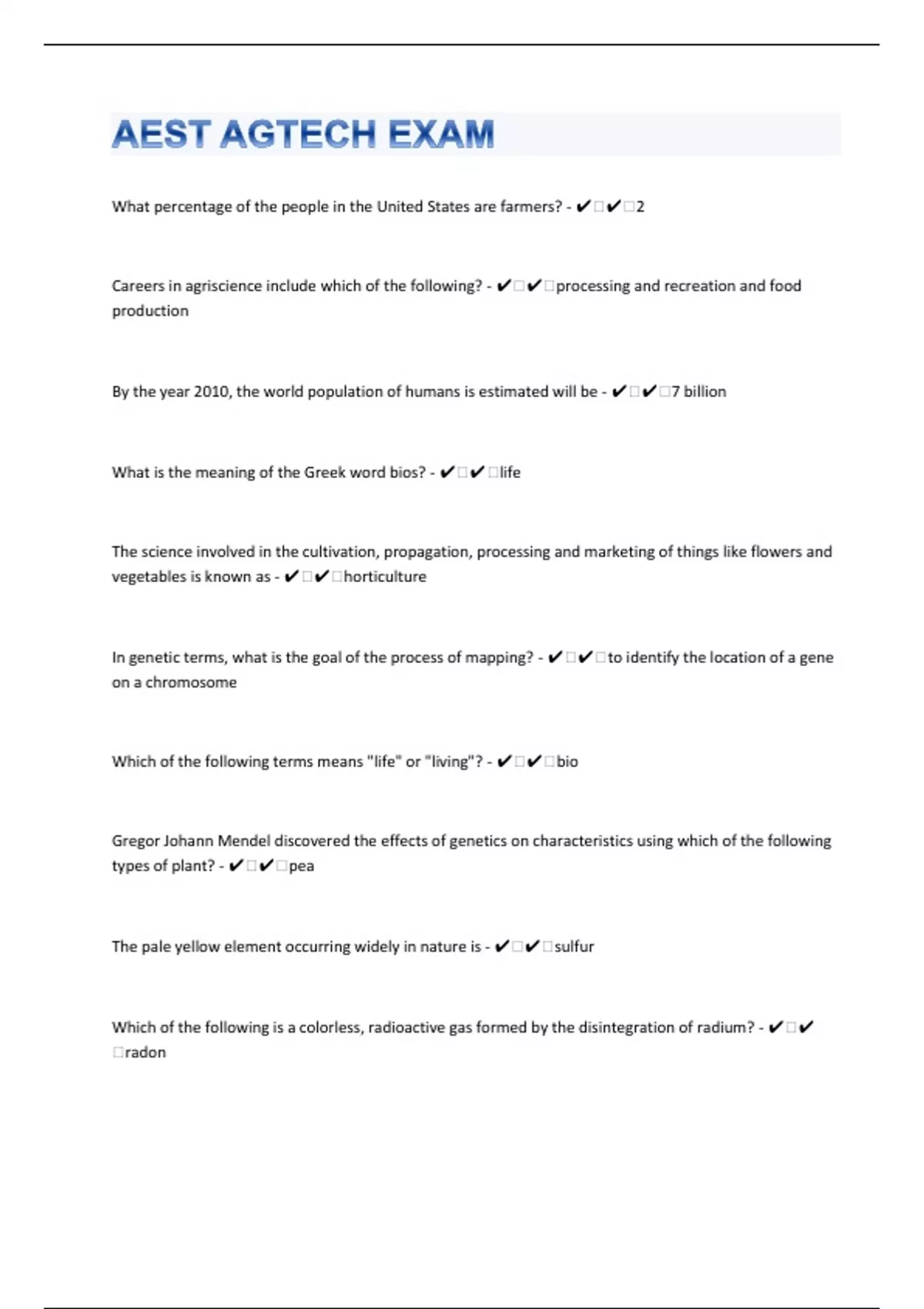 What percentage of the people in the United States are farmers? - ️️2 Careers in agriscience include which of the following? - ️️processing and recreation and food production By the year 2010, the world population of humans is estimated will be - ️️7 billion What is the meaning of the Greek word bios? - ️️life The science involved in the cultivation, propagation, processing and marketing of things like flowers and vegetables is known as - ️️horticulture In genetic terms, what is the goal of the process of mapping? - ️️to identify the location of a gene on a chromosome Which of the following terms means "life" or "living"? - ️️bio Gregor Johann Mendel discovered the effects of genetics on characteristics using which of the following types of plant? - ️️pea The pale yellow element occurring widely in nature is - ️️sulfur Which of the following is a colorless, radioactive gas formed by the disintegration of radium? - ️️radon