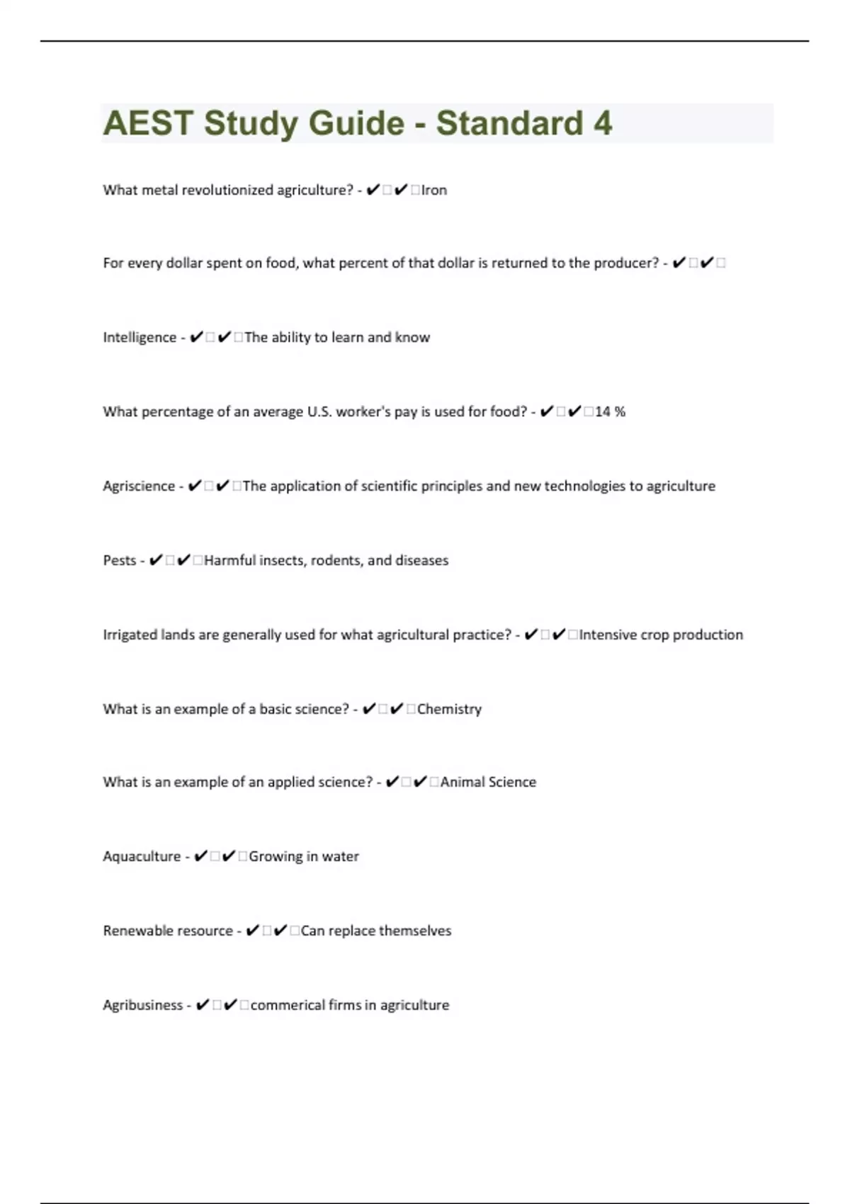 What metal revolutionized agriculture? - ️️Iron For every dollar spent on food, what percent of that dollar is returned to the producer? - ️️ Intelligence - ️️The ability to learn and know What percentage of an average U.S. worker's pay is used for food? - ️️14 % Agriscience - ️️The application of scientific principles and new technologies to agriculture Pests - ️️Harmful insects, rodents, and diseases Irrigated lands are generally used for what agricultural practice? - ️️Intensive crop production What is an example of a basic science? - ️️Chemistry What is an example of an applied science? - ️️Animal Science Aquaculture - ️️Growing in water Renewable resource - ️️Can replace themselves Agribusiness - ️️commerical firms in agriculture