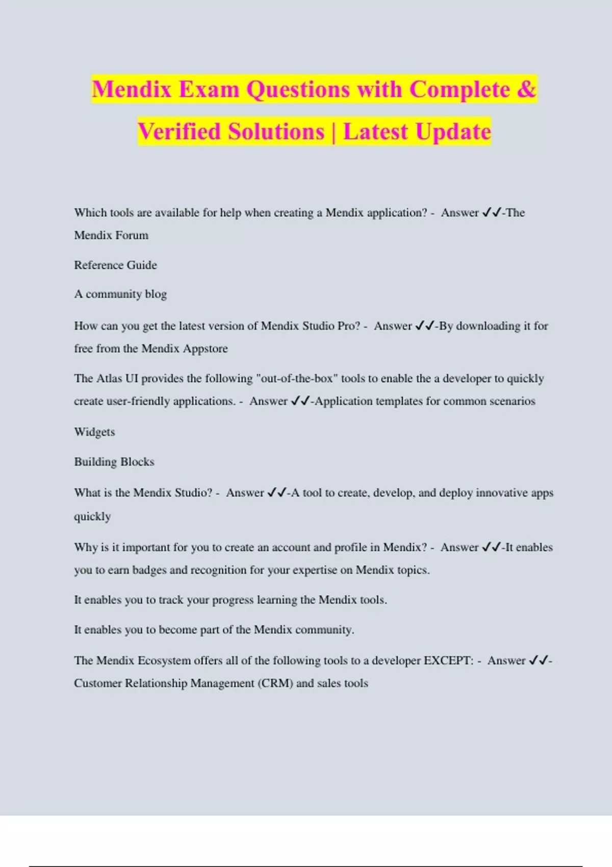Mendix Exam Questions with Complete & Verified Solutions | Latest Update Which tools are available for help when creating a Mendix application? - Answer ️️ -The Mendix Forum Reference Guide A community blog How can you get the latest version of Mendix Studio Pro? - Answer ️️ -By downloading it for free from the Mendix Appstore The Atlas UI provides the following "out-of-the-box" tools to enable the a developer to quickly create user-friendly applications. - Answer ️️ -Application templates for common scenarios Widgets Building Blocks What is the Mendix Studio? - Answer ️️ -A tool to create, develop, and deploy innovative apps quickly Why is it important for you to create an account and profile in Mendix? - Answer ️️ -It enables you to earn badges and recognition for your expertise on Mendix topics. It enables you to track your progress learning the Mendix tools. It enables you to become part of the Mendix community. The Mendix Ecosystem offers all of the following tools to a developer EXCEPT: - Answer ️️ - Customer Relationship Management (CRM) and sales tools