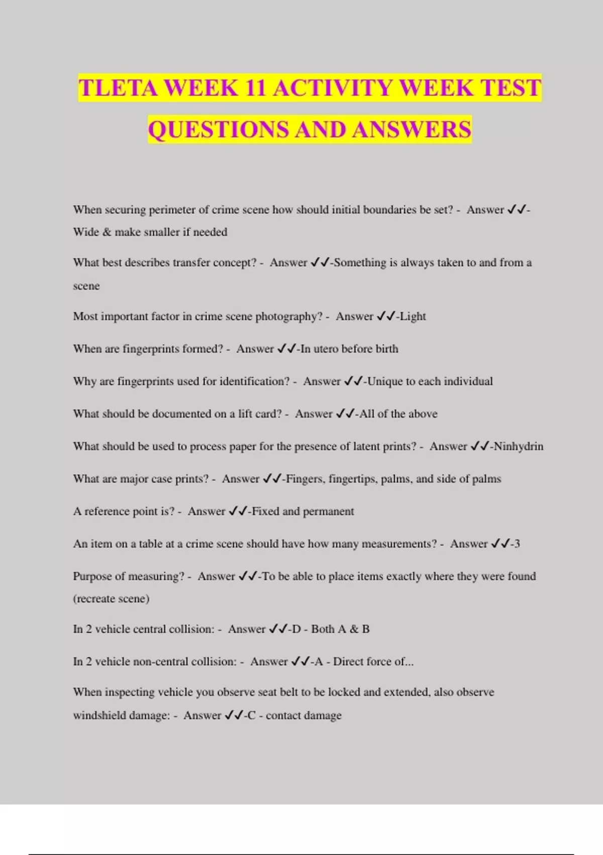 TLETA WEEK 11 ACTIVITY WEEK TEST QUESTIONS AND ANSWERS When securing perimeter of crime scene how should initial boundaries be set? - Answer ️️ - Wide & make smaller if needed What best describes transfer concept? - Answer ️️ -Something is always taken to and from a scene Most important factor in crime scene photography? - Answer ️️ -Light When are fingerprints formed? - Answer ️️ -In utero before birth Why are fingerprints used for identification? - Answer ️️ -Unique to each individual What should be documented on a lift card? - Answer ️️ -All of the above What should be used to process paper for the presence of latent prints? - Answer ️️ -Ninhydrin What are major case prints? - Answer ️️ -Fingers, fingertips, palms, and side of palms A reference point is? - Answer ️️ -Fixed and permanent An item on a table at a crime scene should have how many measurements? - Answer ️️ -3 Purpose of measuring? - Answer ️️ -To be able to place items exactly where they were found (recreate scene) In 2 vehicle central collision: - Answer ️️ -D - Both A & B In 2 vehicle non-central collision: - Answer ️️ -A - Direct force of... When inspecting vehicle you observe seat belt to be locked and extended, also observe windshield damage: - Answer ️️ -C - contact damage