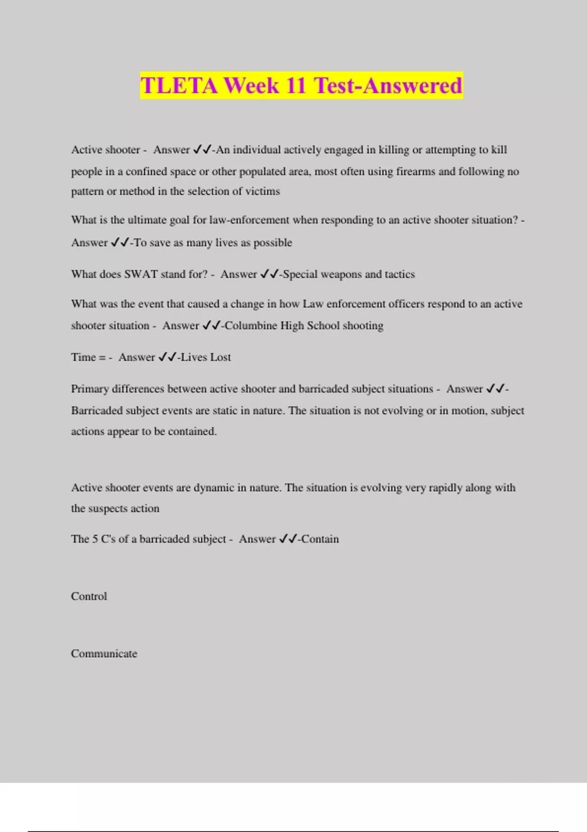 TLETA Week 11 Test-Answered Active shooter - Answer ️️ -An individual actively engaged in killing or attempting to kill people in a confined space or other populated area, most often using firearms and following no pattern or method in the selection of victims What is the ultimate goal for law-enforcement when responding to an active shooter situation? - Answer ️️ -To save as many lives as possible What does SWAT stand for? - Answer ️️ -Special weapons and tactics What was the event that caused a change in how Law enforcement officers respond to an active shooter situation - Answer ️️ -Columbine High School shooting Time = - Answer ️️ -Lives Lost Primary differences between active shooter and barricaded subject situations - Answer ️️ - Barricaded subject events are static in nature. The situation is not evolving or in motion, subject actions appear to be contained. Active shooter events are dynamic in nature. The situation is evolving very rapidly along with the suspects action The 5 C's of a barricaded subject - Answer ️️ -Contain Control Communicate Call SWAT Create a plan What type of a response by law-enforcement does an active shooter situation dictates - Answer ️️ -An immediate and aggressive response to actively seek out and eliminate the threat to minimize loss of life or injury to victims. Do initial officers have to bypass victims during an active shooter situation? - Answer ️️ -Yes Why do terrorist organizations use active shooters? - Answer ️️ -Publicity for their c