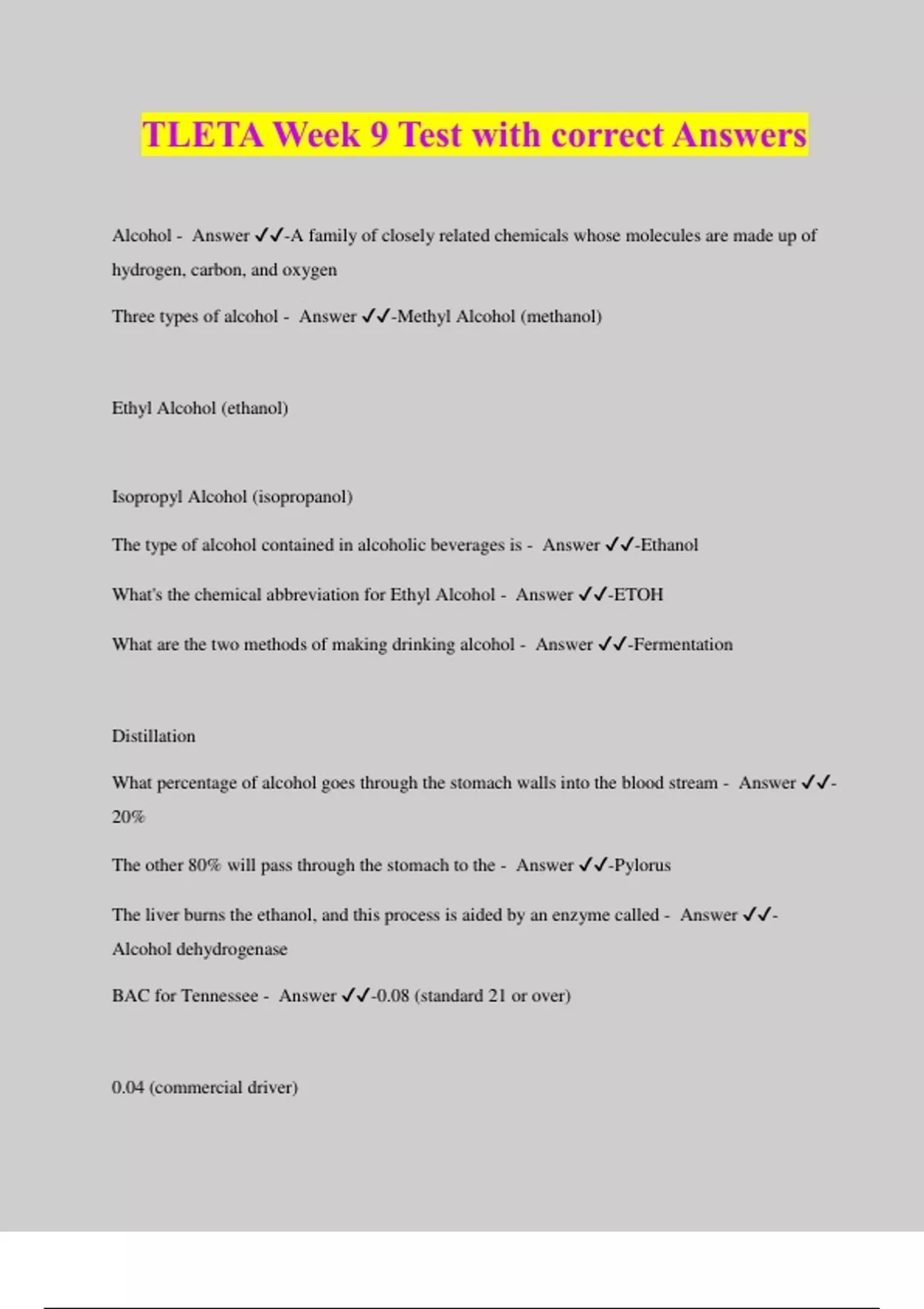 TLETA Week 9 Test with correct Answers Alcohol - Answer ️️ -A family of closely related chemicals whose molecules are made up of hydrogen, carbon, and oxygen Three types of alcohol - Answer ️️ -Methyl Alcohol (methanol) Ethyl Alcohol (ethanol) Isopropyl Alcohol (isopropanol) The type of alcohol contained in alcoholic beverages is - Answer ️️ -Ethanol What's the chemical abbreviation for Ethyl Alcohol - Answer ️️ -ETOH What are the two methods of making drinking alcohol - Answer ️️ -Fermentation Distillation What percentage of alcohol goes through the stomach walls into the blood stream - Answer ️️ - 20% The other 80% will pass through the stomach to the - Answer ️️ -Pylorus The liver burns the ethanol, and this process is aided by an enzyme called - Answer ️️ - Alcohol dehydrogenase BAC for Tennessee - Answer ️️ -0.08 (standard 21 or over) 0.04 (commercial driver)