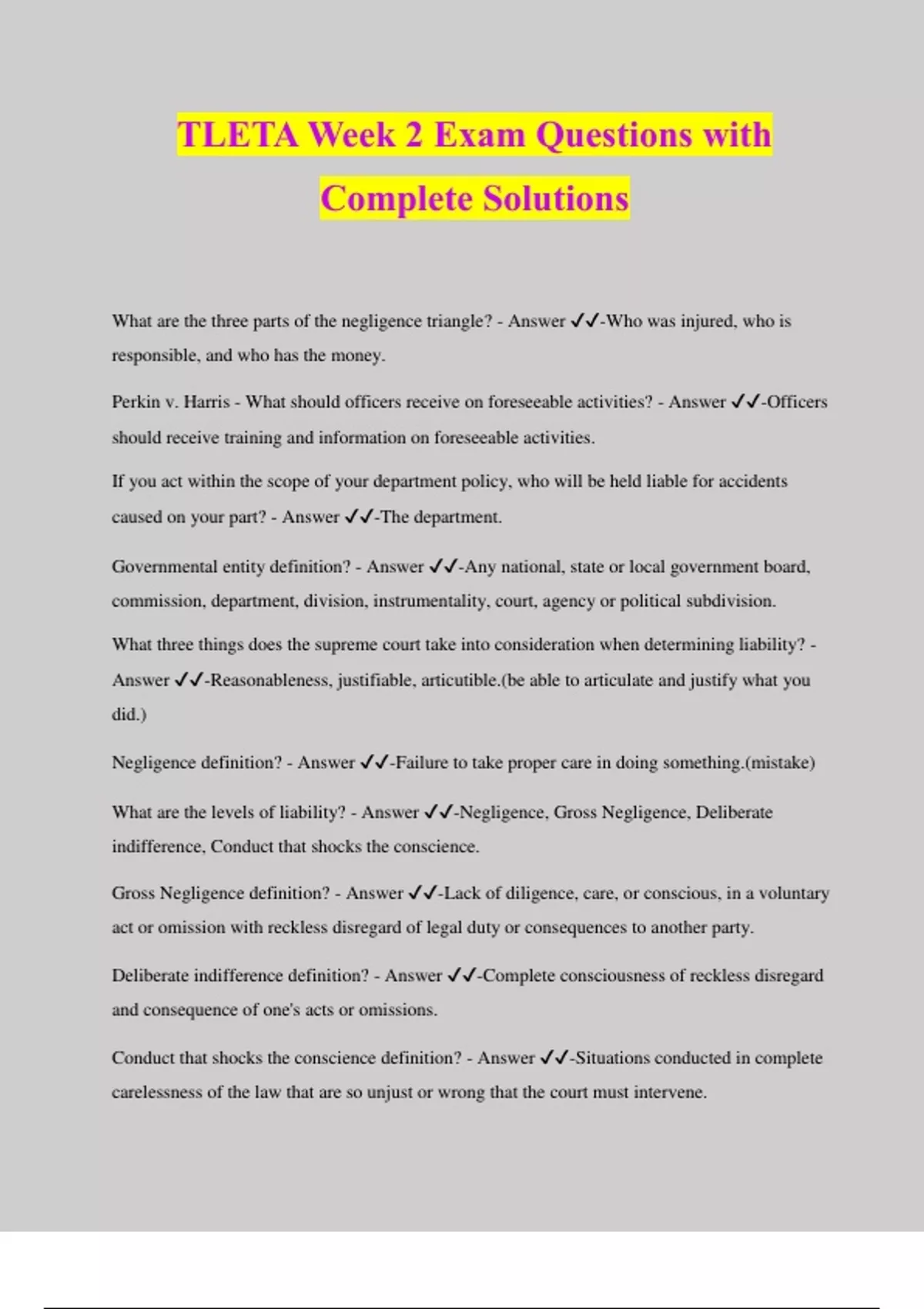 TLETA Week 2 Exam Questions with Complete Solutions What are the three parts of the negligence triangle? - Answer ️️ -Who was injured, who is responsible, and who has the money. Perkin v. Harris - What should officers receive on foreseeable activities? - Answer ️️ -Officers should receive training and information on foreseeable activities. If you act within the scope of your department policy, who will be held liable for accidents caused on your part? - Answer ️️ -The department. Governmental entity definition? - Answer ️️ -Any national, state or local government board, commission, department, division, instrumentality, court, agency or political subdivision. What three things does the supreme court take into consideration when determining liability? - Answer ️️ -Reasonableness, justifiable, articutible.(be able to articulate and justify what you did.) Negligence definition? - Answer ️️ -Failure to take proper care in doing something.(mistake) What are the levels of liability? - Answer ️️ -Negligence, Gross Negligence, Deliberate indifference, Conduct that shocks the conscience. Gross Negligence definition? - Answer ️️ -Lack of diligence, care, or conscious, in a voluntary act or omission with reckless disregard of legal duty or consequences to another party. Deliberate indifference definition? - Answer ️️ -Complete consciousness of reckless disregard and consequence of one's acts or omissions. Conduct that shocks the conscience definition? - Answer ️️ -Situations conducted in complete carelessness of the law that are so unjust or wrong that the court must intervene.